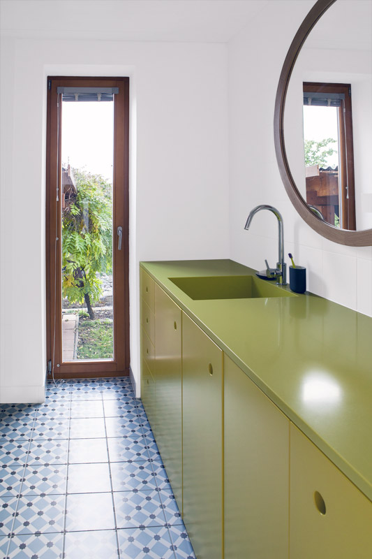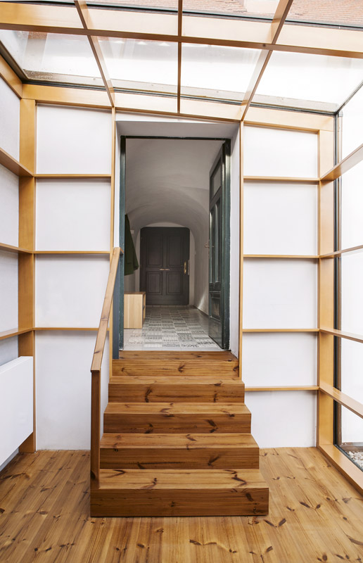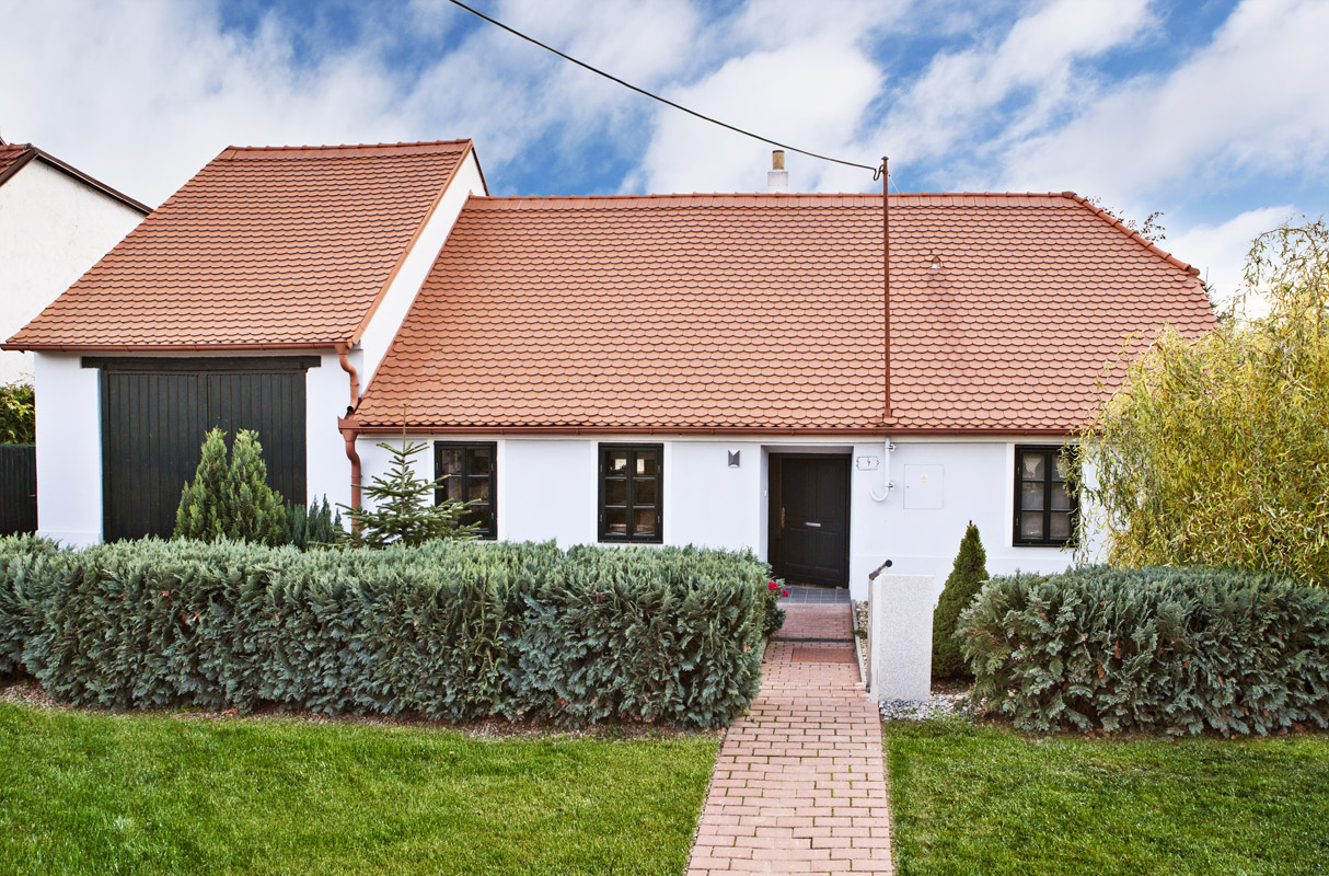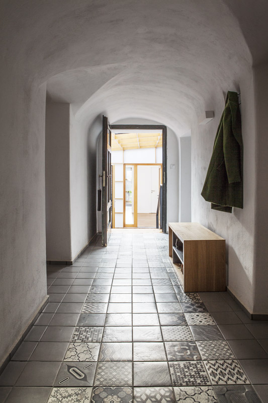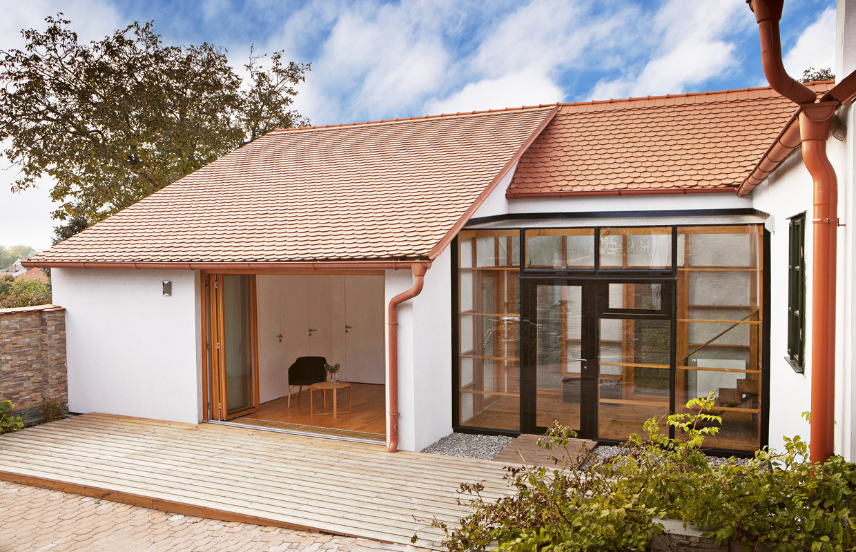 Část domu do ulice zůstala v maximální míře původní – střecha, okna, stropy, cihlové klenby. Dnes v ní matka paní architektky vaří úžasné dobroty. Druhá, původně hospodářská část je současná. Velká okna, hodně světla, moderní materiály. A celé to propojila právě skleněná veranda, jednotná střecha z bobrovek a hlavně dvůr.