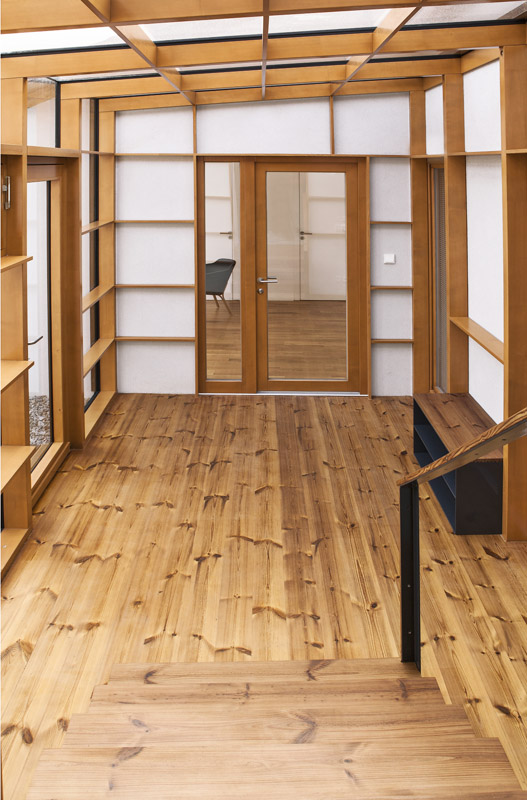 Obě části zůstávaly v původní dispozici nepropojené. Padlo tedy rozhodnutí vytvořit nový spojovací prvek, prosklenou verandu.