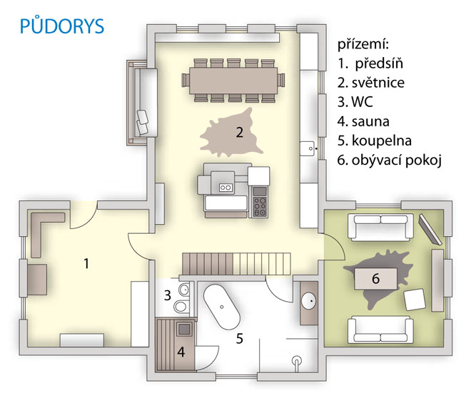 Základ kuchyňské linky postupně doplnila ještě vinotéka, řada nízkých skříněk za jídelním stolem a knihovna s vitrínou (vše vyrobené na míru studiem Sykora). Pro toho, komu by snad hřejivá atmosféra světnice nestačila, je v přízemí připravená ještě prostorná wellness koupelna, kde se může prohřát v domácí sauně.