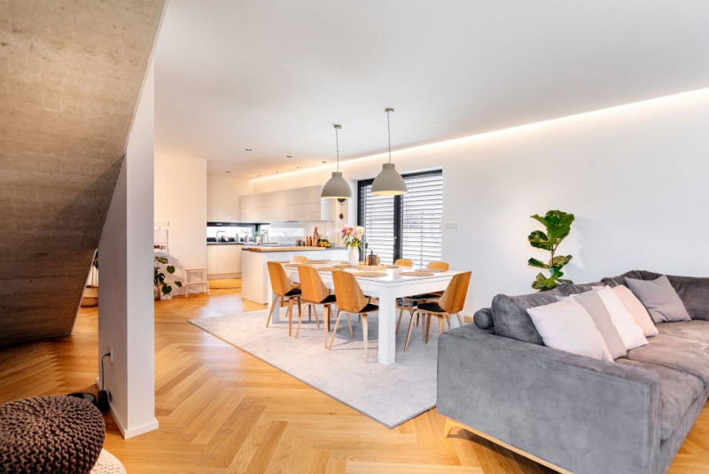 Jirka pojal dřevěnici jako svůj pracovní projekt, obrovského koníčka a relaxaci v jednom. Od odborníků si nechal postavit hrubou stavbu, položit podlahy a obklady a o víkendech nastoupil se svým kamarádem na druhou směnu. „Sádrokartony, zateplení, elektřinu, vodu – to všechno jsme dělali sami. Byla to fuška, ale hrozně moc jsme se při tom naučili,“ vzpomíná.