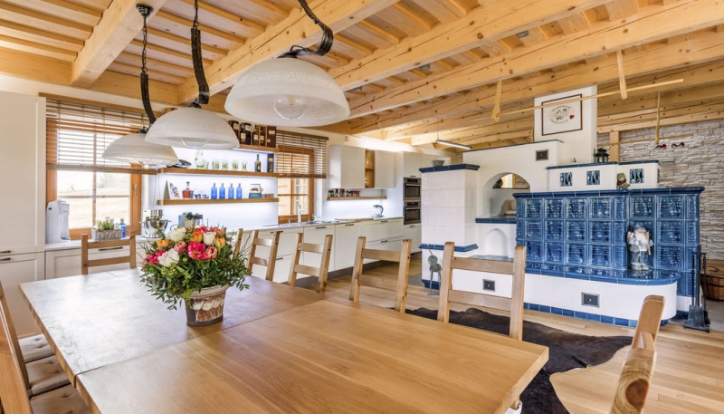 Srdcem celého domu je prostorná světnice, která zabírá téměř celou přízemní část domu. Tady se vaří, společně stoluje, ale i relaxuje. Jedním ze snů Jiřího a jeho ženy bylo nechat tu postavit kachlová kamna s pecí, na kterých by se dalo pohodlně ležet. Výroby se ujal Mojmír Jauernig ze Šumperka, který je třetí generací kamnářů ve svém rodě.