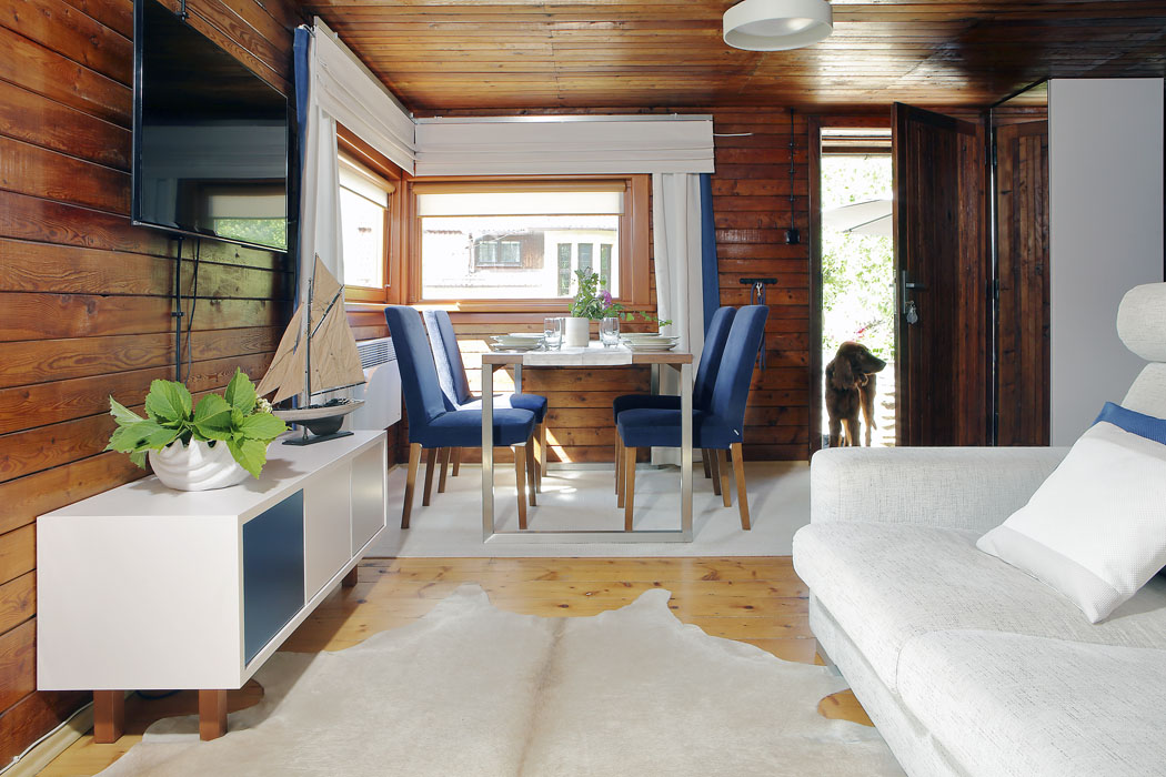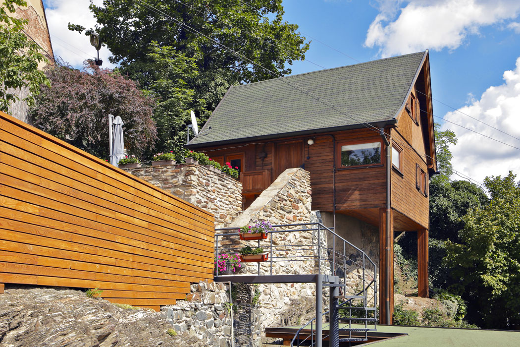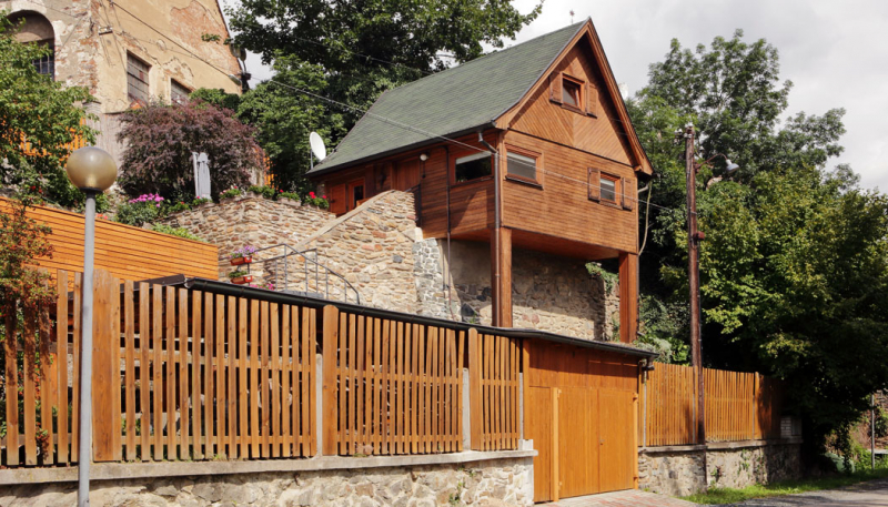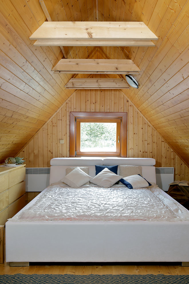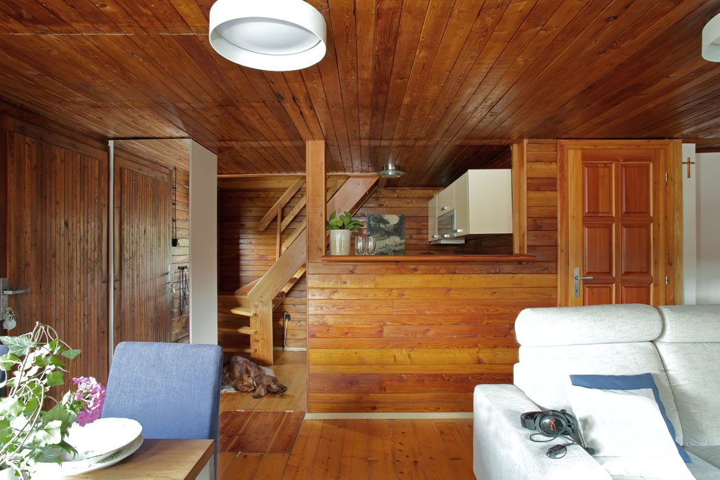 „Nejtěžší bylo poradit si se svažitým terénem a sehnat řemeslníky,“ komentuje rekonstrukci majitelka chaty. Nacházíme se v přízemí, kde byl vybudován stylový obývací kout, kuchyň a koupelna a vyvýšený prostor na spaní.
