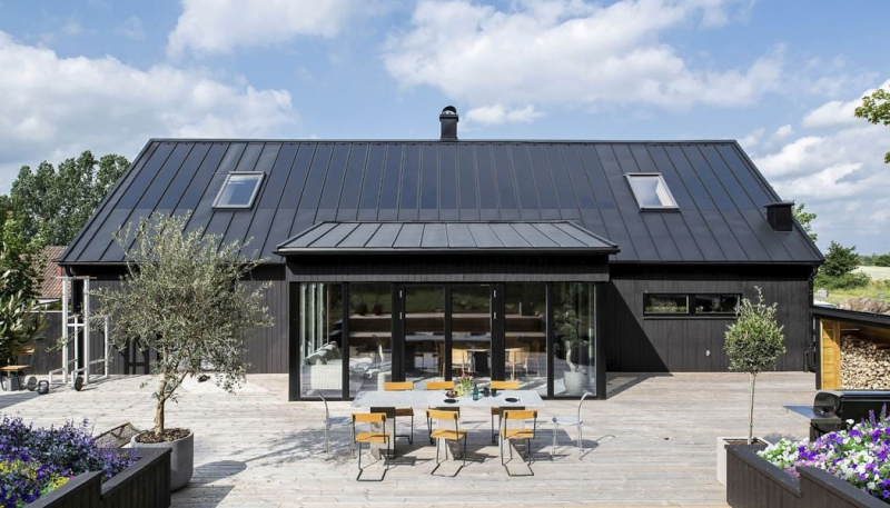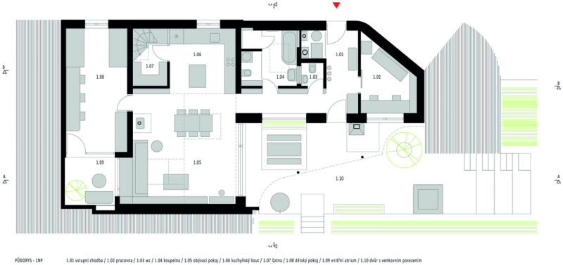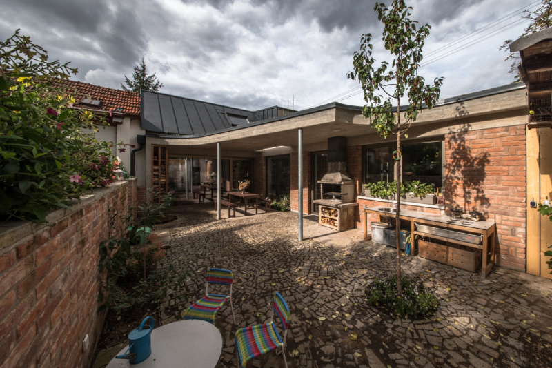 Na straně do dvora tvoří obvodovou část více skleněných ploch než neprůhledných zdí a přirozené světlo pustili do domu i střešními okny. V části pod sedlovou střechou v původním objektu je obývací pokoj s jídelním stolem. „Prostor je zcela otevřen do střechy a kromě rozsáhlé prosklené plochy z hliníkového HS portálu je prosvětlen i shora, dálkově ovladatelnými střešními okny, s vnitřním i vnějším zastíněním,“ popisuje Ing. arch. Radim Horák.