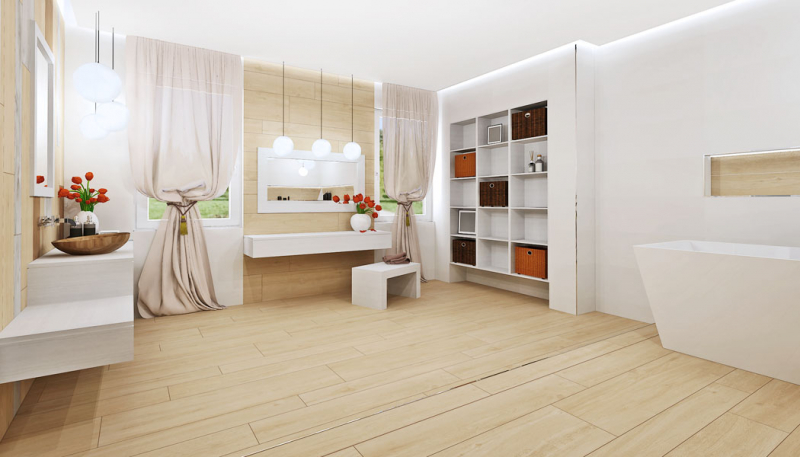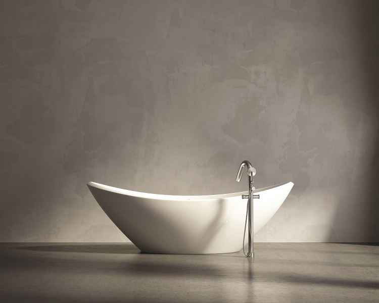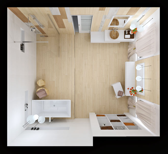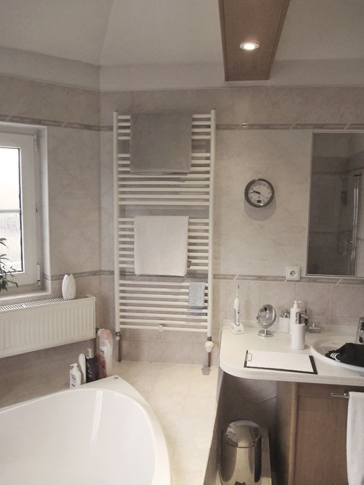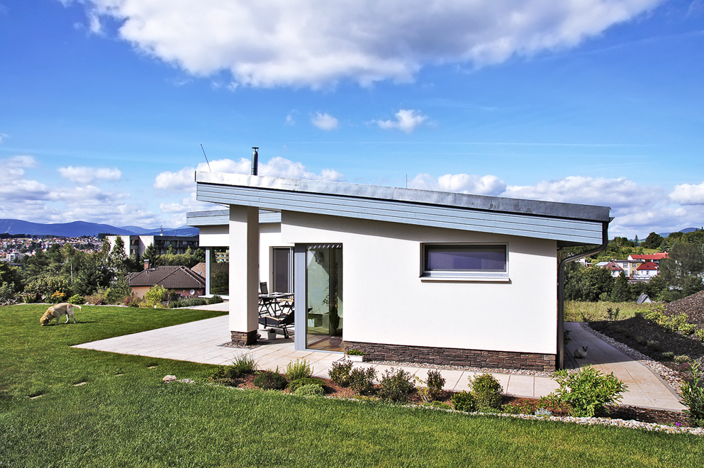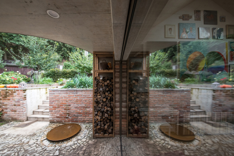 Dalším jednotícím prvkem v interiéru i exteriéru je kruh. „Kulaté prvky dojem změkčí, proto se v domě prvek kruhu opakuje – líbí se nám kulaté rohy nábytku, vana je zaoblená, zrcadlo ve vstupu má tvar kruhu, okénka ve dveřích koupelny a toalety jsou kulatá….,“ vypočítává Ing. arch. Radim Horák. Ostatně i venkovní přesah střešní terasy má oblý tvar (reaguje na strom), stejně jako vodní prvek.