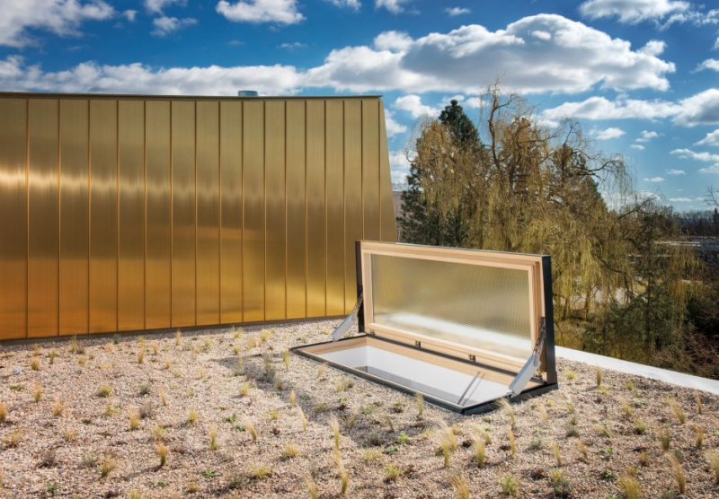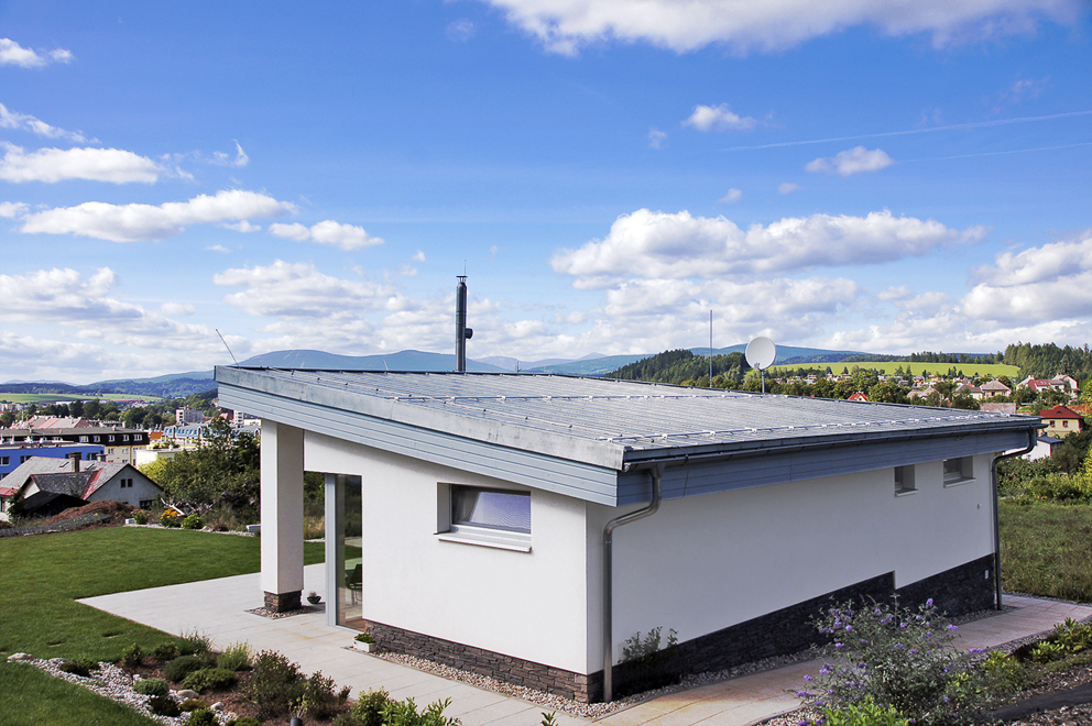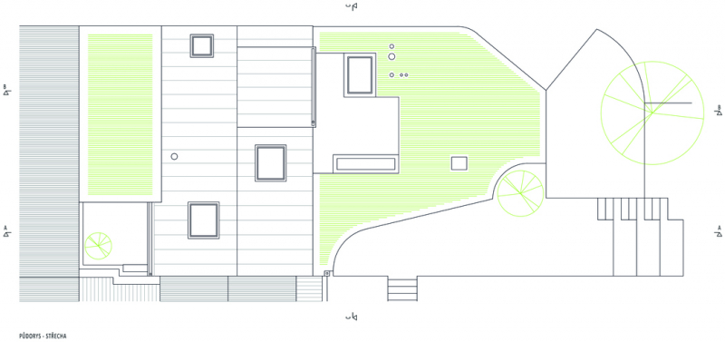 Původní část objektu architekti hmotově sjednotili a zjednodušili (přístavky jsou nově zastřešeny plochou střechou v jedné rovině). Šikmá střecha je opět pokryta plechem, ale nově v antracitové barvě (dříve byl červený), která odkazuje na někdejší použití černých asfaltových pásů jako krytiny u původních nouzových domků. Tehdy byla střešní krajina celé lokality různorodá, podtrhující „vlaštovčí hnízdo“, tak typické pro dané území. Celý původní objem byl zateplen minerální vatou a omítnut. „Dům stojí na dně lomu, takže střecha je v podstatě třetí fasádou – lidé, kteří jdou po hraně lomu, na střechu vidí, proto jsme ji řešili i pohledově. Materiálově i barevně jsme sjednotili vikýř a střešní okna s plechem střechy, proto jsme vybrali antracitový odstín,“ pokračuje Ing. arch. Radim Horák.