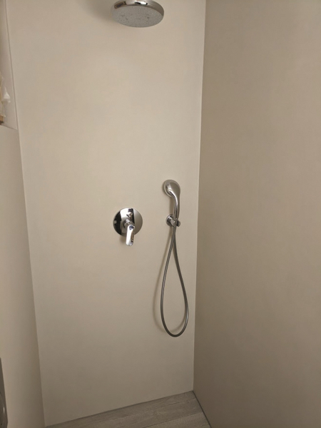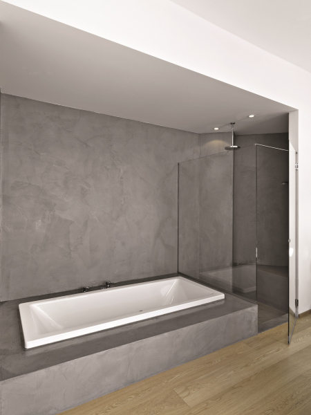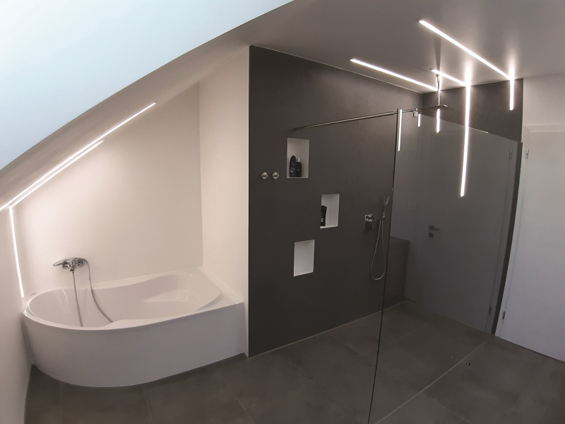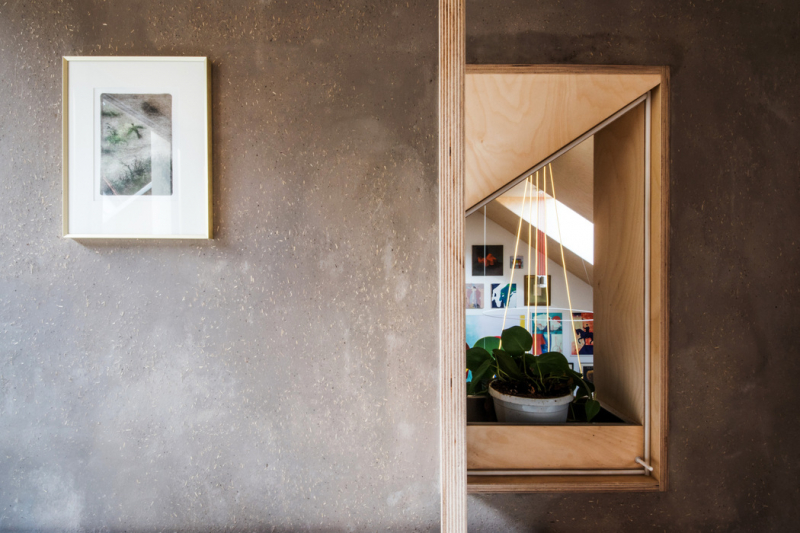 Stěny koupelny, WC a plochy nad kuchyňskou linkou jsou z marockého štuku. Štít a vždy jedna stěna v dětském pokoji, pracovně a ložnici je realizována jako černá hliněná s řezankovým zlatavým vsypem. „Do hliněné omítky je zapracována na jemno nasekaná sláma, která se leskne a mění barvu, když na ni dopadají sluneční paprsky, takže v průběhu dne mění náladu interiéru,“ vysvětluje architekt.