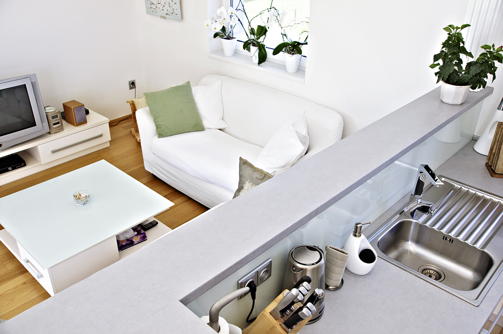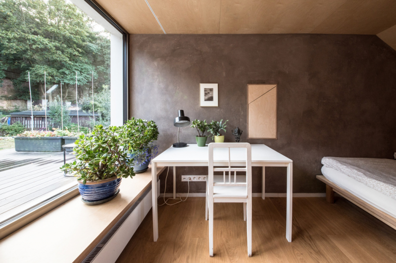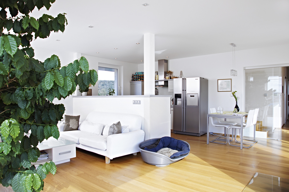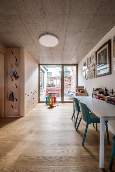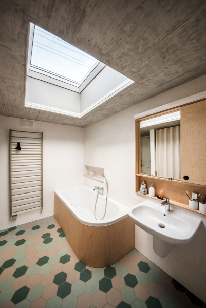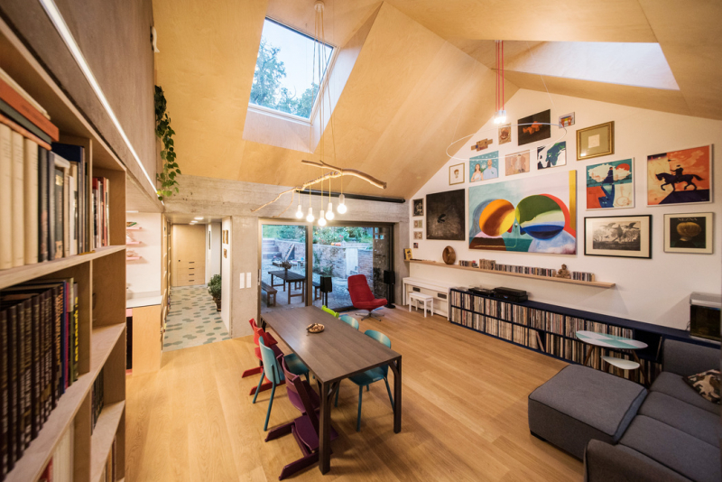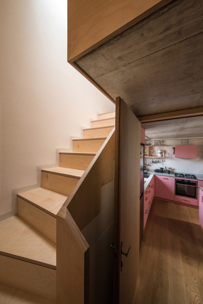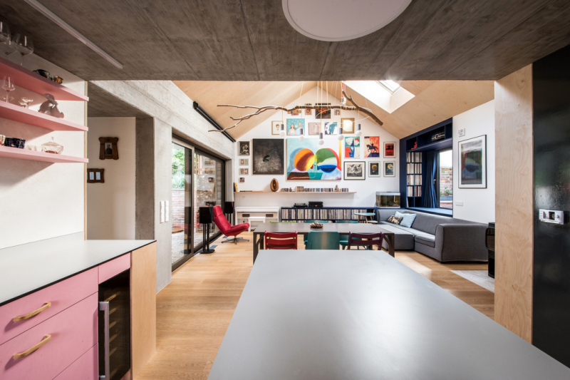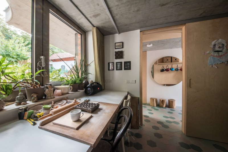 Nová přístavba má na podlaze ve hmotě probarvenou dlažbu, stará část pak třívrstvou dřevěnou dubovou lamelu. Celým domem prochází přírodní březová překližka (nábytky, obklad vstupu, dveře, podhled obývacího pokoje a ložnice), lokálně pak probarvená překližka (modrá – odpočinkový kout obývacího pokoje, růžová – kuchyň). „Máme rádi barvy, proto jsme se nápadu naší dcery s růžovou kuchyní nezalekli a snažili se tuto ne úplně obvyklou barvu vhodně materiálově a barevně doplnit,“ pokračuje Ing. arch. Radim Horák. Speciálním prvkem kuchyně je i tzv. chytrá stěna, magnetická a popisovatelná zároveň – děti mají kde malovat, rodiče zase prostor třeba na nákupní seznam…