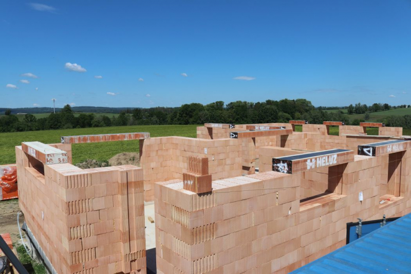 Nová přístavba je celá řešena s plochou střechou, stěny jsou sendvičové, kdy pohledové části do exteriéru tvoří vyzdívka z plných pálených cihel, získaných z bouracích prací na původním domě. Cihly mají odkazovat na někdejší obyvatele lokality, kteří byli často zaměstnanci nedalekých cihelen, z kterých si stavební materiál nosili. Cihly jsou doplněny o pohledové betony (sokl, atika), které vybíhají do dvora v jednoduché přestřešení nad venkovním sezením. Ploché střechy jsou pojaté jako zelené extenzivní, nad novou přístavbou doplněné o malou pobytovou terasu. Vnitřní zdivo, dozdívky apod. jsou z broušených keramických tvárnic.