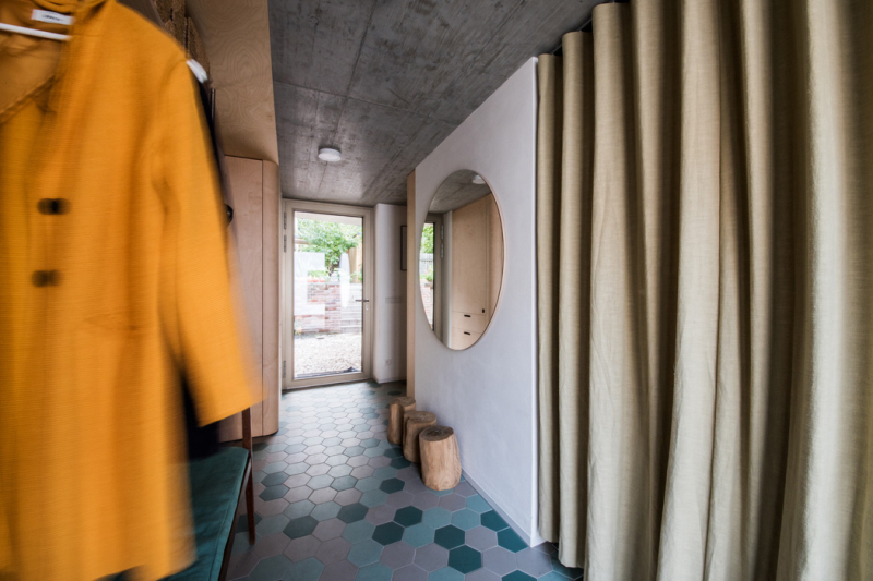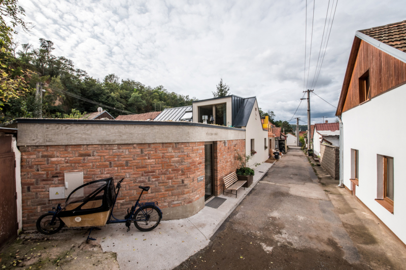Vstup do domu byl přesunut do nové přístavby, která je navržena s co nejmenší konstrukční výškou (světlá výška uvnitř je jen 2.3 m a stropy jsou řešené jako pohledové železobetonové). Na vstup navazuje chodba, kterou lze projít domem do dvora, hned za dveřmi při vstupu je navržen technický kout, na druhé straně je za posuvnými dveřmi malá lichoběžníková pracovna (reaguje na tvar pozemku). Před dveřmi do dvora se chodba stáčí podél krytého venkovního sezení a míří do původního objektu, podél ní je navržena knihovna, ve které jsou umístěny dveře na samostatné WC a do koupelny. Ta je uvnitř prosvětlena střešním světlíkem, rovněž elektricky ovládaným.