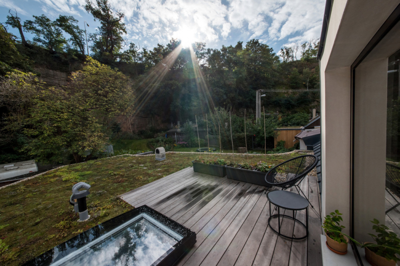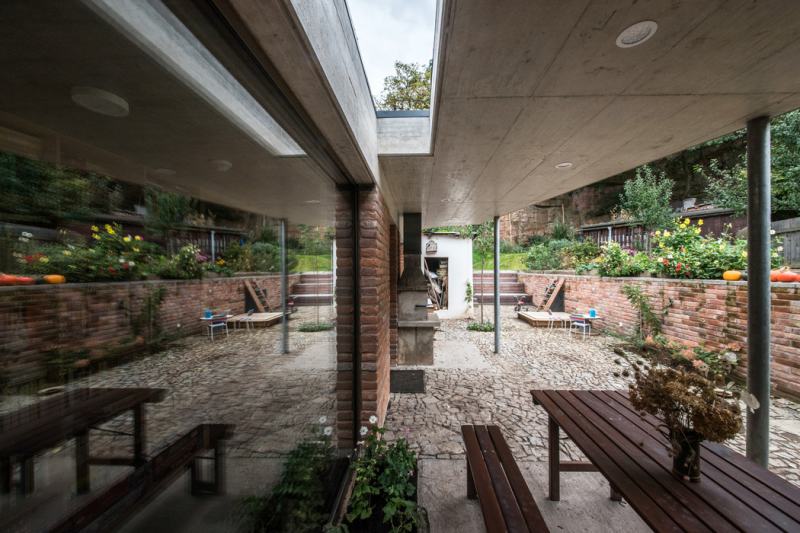 Jako třeba v podobě velkých prosklených ploch hliníkových oken nebo elektricky ovládaných střešních oken, kterými architekti pustili přirozené světlo do tmavého interiéru svého domku na dně lomu blízko skalní stěny. Architekti Radim a Hana Horákovi si bydlení nedaleko centra Brna a zároveň u řeky a lesa oblíbili, je to pro ně „taková vesnice ve městě“, rostoucí děti je však přiměly pustit se do rekonstrukce.