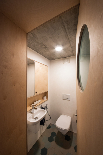 Z kuchyňského koutu lze vejít do malé šatny a po schodišti vystoupat do ložnice, s velkoplošným hliníkovým oknem, které zároveň zpřístupňuje vegetační střešní terasu. Ložnice se vikýřem otevírá ke skalní stěně lomu. Z obývacího pokoje vedou dveře do části s bývalými přístavky, dnešního dětského pokoje pro tři malé děti. Ty mají k dispozici i malé vnitřní atrium, sevřené mezi okolními domy, do něhož ústí velké sedací okno ze strany obývacího pokoje.