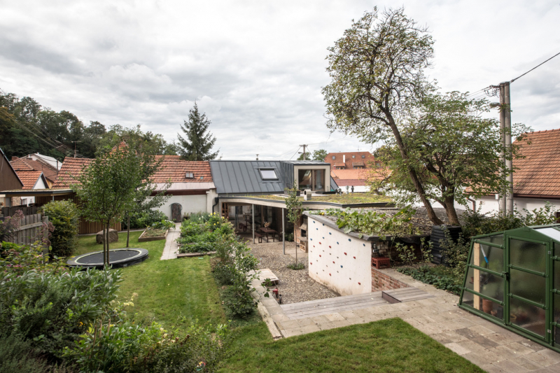 Jednopodlažní dům se sedlovou střechou s plechovou krytinou byl prorostlý s okolními domy, jak konstrukcemi, tak i sítěmi. Cílem rekonstrukce proto bylo objekt stavebně oddělit, včetně vybudování vlastních přípojek technické infrastruktury, navýšit užitnou plochu objektu a především přinést do interiéru co nejvíce přirozeného světla. „Stavbu jsme chtěli zachovat co nejnižší, proto jsme navrhli uskutečnit navýšení užitné plochy částečným zastavěním stávajícího dvorku novou jednopodlažní přístavbou. Hmotově zůstal patrný původní objekt, od nové části pohledově oddělený. Původní vnitřní zdivo bylo odstraněno, celý interiér jsme vyčistili a podlahy výškově srovnali do jedné roviny. Dům leží na dně lomu v blízkosti skalní stěny a slunce se k němu dostává docela pozdě, proto jsme jej chtěli co nejvíce prosvětlit, což se nám podařilo,“ pokračuje architekt a spokojený obyvatel domu v jedné osobě.
