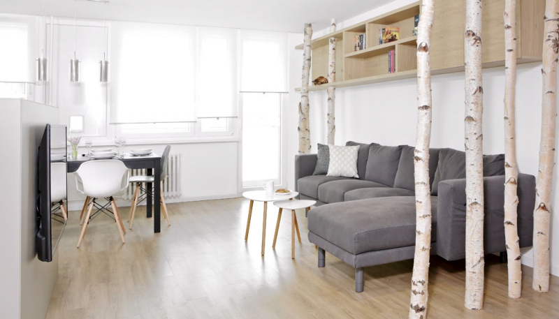 Kmeny břízek jsou tu pro nápaditou dekoraci, ale hlavně pro kočičí vyžití. Druhým zvířecím výdobytkem jsou police, jejichž otevřené díly slouží kočkám jako prolézačky. Uzavřené části polic slouží jako úložné prostory na knihy, dekorace a jiné věci. Pro pozorování mazlíčků na balkoně je zase vhodná lavice, navazující na kuchyňskou linku. Samozřejmostí jsou v bytě průlezová kočičí dvířka skrz dveře ložnice a zaslepené okno na balkon.