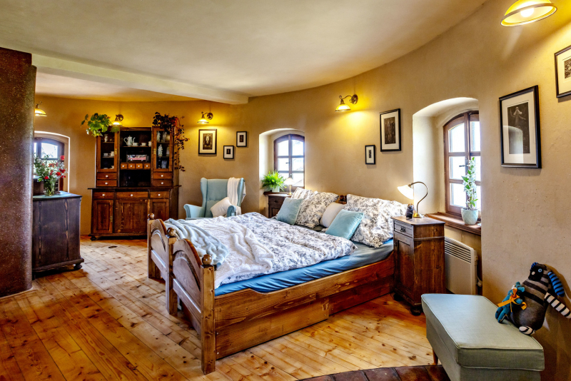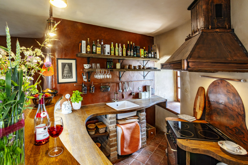 Najdeme tady samozřejmě i další nádherné povrchové úpravy, včetně nátěrů vápenných stěrek. Za zmínku jistě stojí tmavý marocký štuk (Tadelakt), což je zajímavá alternativa obkladů beze spár. Objevuje se ve sprchovém koutě, kolem umyvadel, kuchyňské linky, ale i jako interiérový doplněk v dalších místnostech. Zdravé vnitřní klima je pro celý objekt velmi důležité, poskytují je pečlivě vybrané materiály, které jsou lidem po staletí blízké, proto se zde cítí přirozeně a svobodně, skoro jako ve volné přírodě.