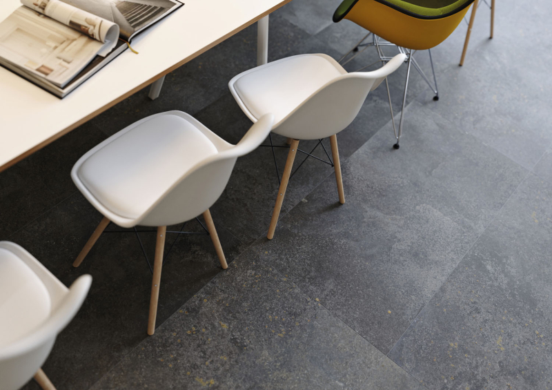 Nepravidelná struktura povrchu série CORE (RAKO), tvořená příčně lámanými kusy kamene, dokonale ztvárňuje štípanou břidlici. Nový reliéf inspirovaný strukturovaným povrchem nabízí na první pohled autentický vzhled kamene, umocněný větším kolísáním designu napříč jednotlivými kusy dlaždic. Flexibilita formátů od 60 x 120 až po 5 x 5 cm a technických doplňků umožňuje architektům integrovat dlaždice do různých stylů a prostředí.