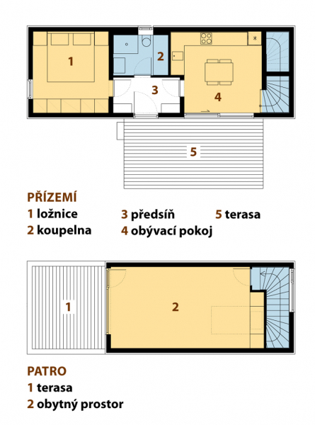 V přízemí byla zachována původní vstupní partie na západní straně i schodiště do podkroví. Zde vznikl z malého pokojíku s kuchyňkou a záchodem komfortní byt 2 + 1 se střešní terasou. Na bývalé pavláčce u schodiště je dnes nová kuchyň, po úpravách krovu se podařilo uvolnit půdní prostor a vytvořit zde obývací pokoj a ložnici, oddělené posuvnou stěnou. Na střeše nově přistaveného traktu má pán domu střešní terasu s posezením, zelení a luxusním výhledem na věž kostela.