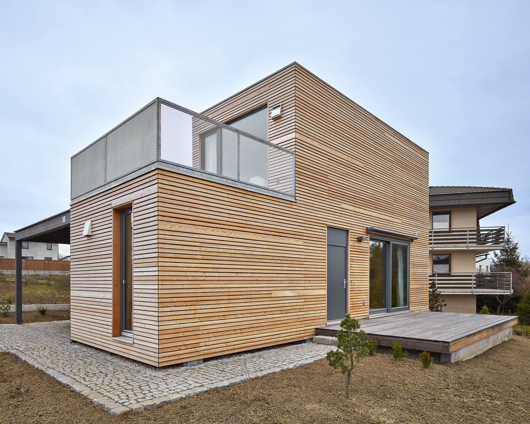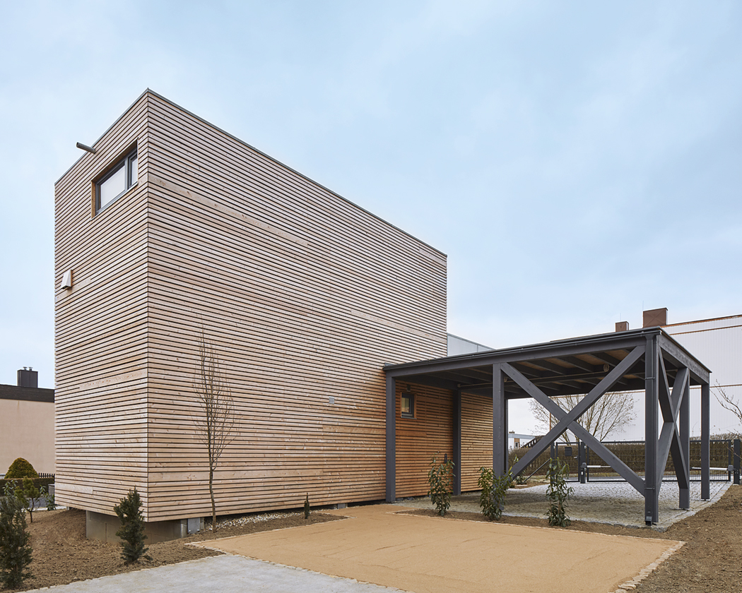 Fasády původního domu se tedy v podstatě nezměnily, směrem do zahrady se připojila přízemní hmota s plochou střechou, velkým prosklením a hliníkovým obkladem fasády – zateplená zděná konstrukce dle současných technických standardů. Na hranici se sousedním pozemkem byl postaven samostatný objekt garážového stání a skladu, provedený v pohledovém betonu.