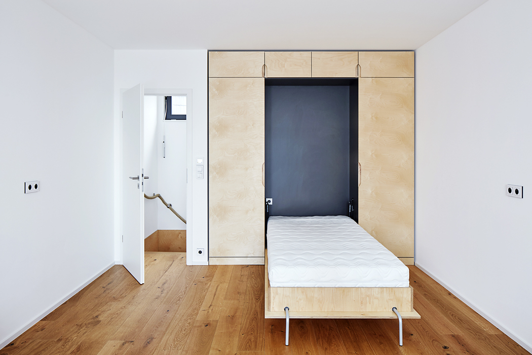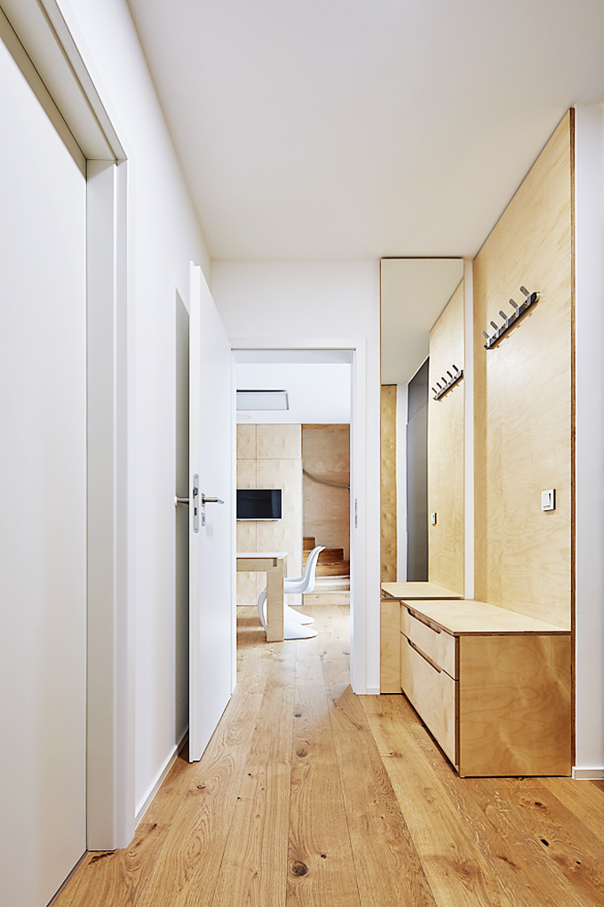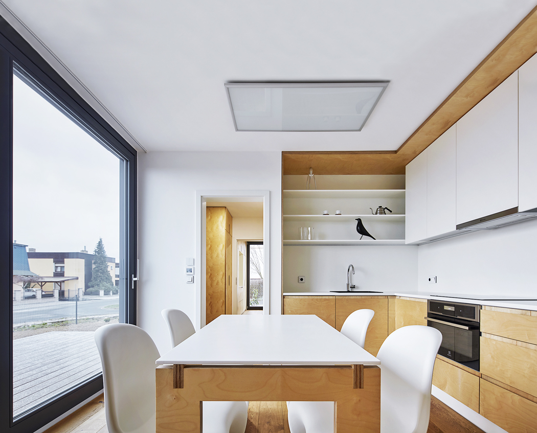 Zbývající prostory přízemí původního domu se staly součástí velkého bytu orientovaného do zahrady. Ve východní fasádě byl vybudován nový vstup, směrem do ulice je ložnice a dětský pokoj. V přistavěné části se nachází velký společný obývací prostor s kuchyní a zázemím.