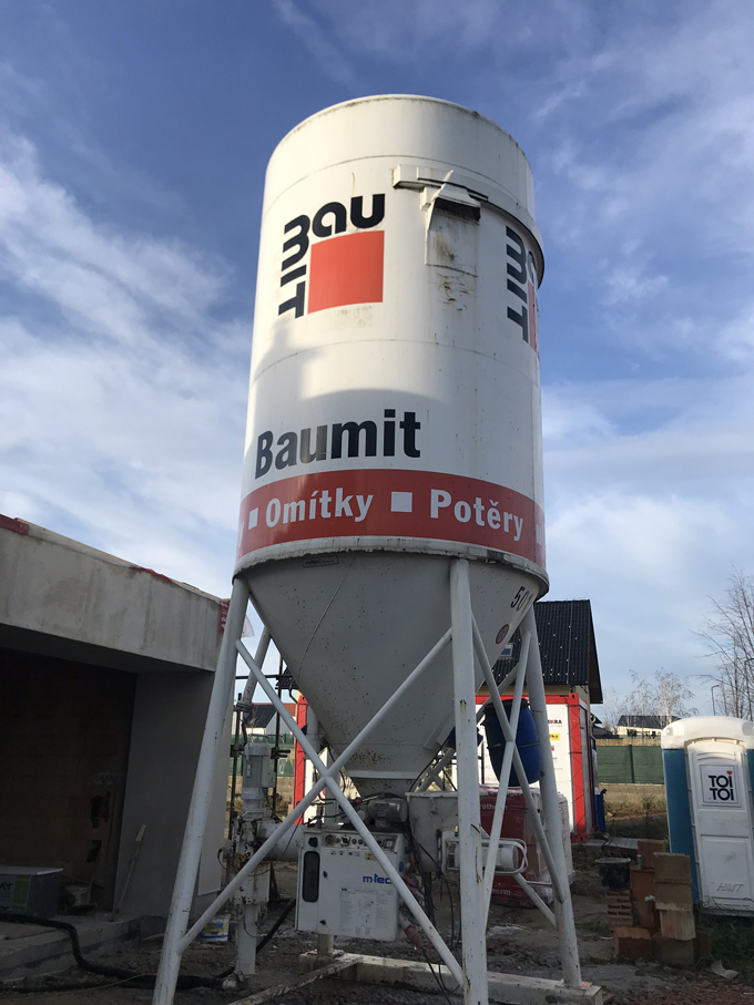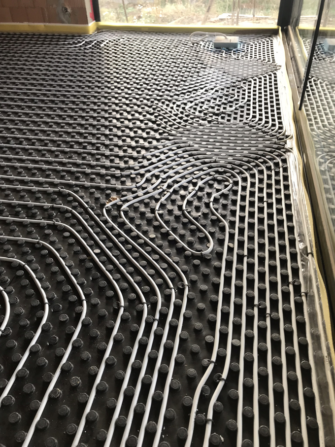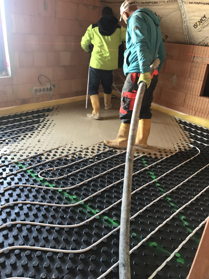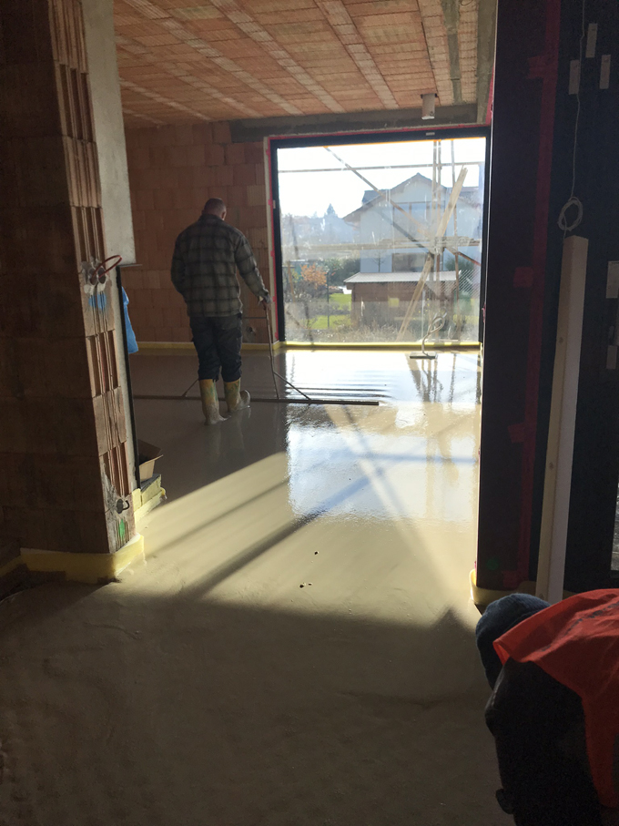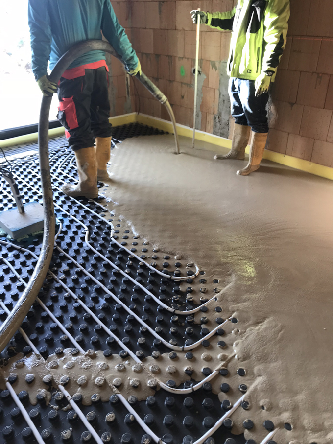 Vylévání podlah anhydridovým samonivelačním roztokem se provádělo na systémové podlahové topení v celém objektu. Směs pro samonivelační podlahu dodala společnost Baumit, která je partnerem projektu. Směs je připravovaná ve speciálním mobilním (výrobním) zařízení. Sila jsou vybavena mísicím a čerpacím zařízením. Pomocí tohoto zařízení je potěr smíchán s vodou a pomocí hadic dopraven až na místo určení – bez nutnosti použití dalšího strojního zařízení. Složení představuje směs síranu vápenatého (tzv. anhydritu), minerálních plniv a dalších přísad zlepšujících samonivelační vlastnosti. Dodávka v sile znamená také minimální skladovací plochu pro materiál na staveništi. Materiál není potřeba zhutňovat a hladit ani přidávat plastifikátory v případě realizací vytápěných podlah. Roztok lze jednoduše, snadno a přesně realizovat i v členitých plochách bytového interiéru. Pro vylití podlah, které zcela opláští vodiče topení, je zapotřebí znát konečnou tloušťku nášlapné vrstvy pro její odečtení od čisté podlahy a tím i stanovení výšky lití anhydritu. Tato výška se během lití hlídá za pomocí laseru. Výsledkem je dokonalý přenos tepla. Další výhodou je rychlé vytvrdnutí anhydritové podlahy, která je prakticky už druhý den pochozí.