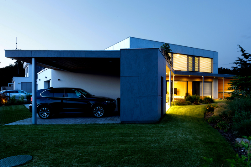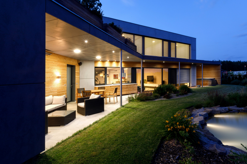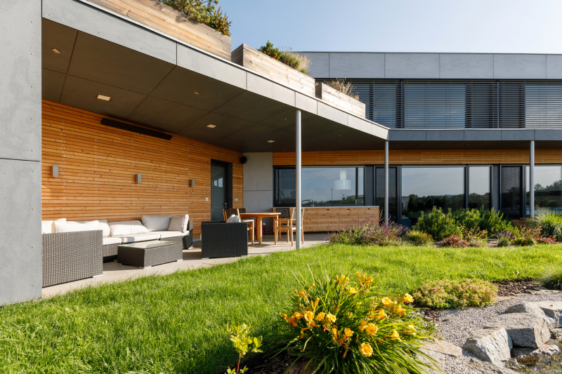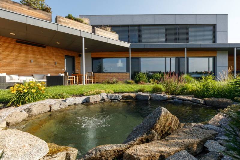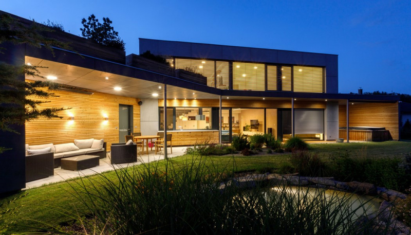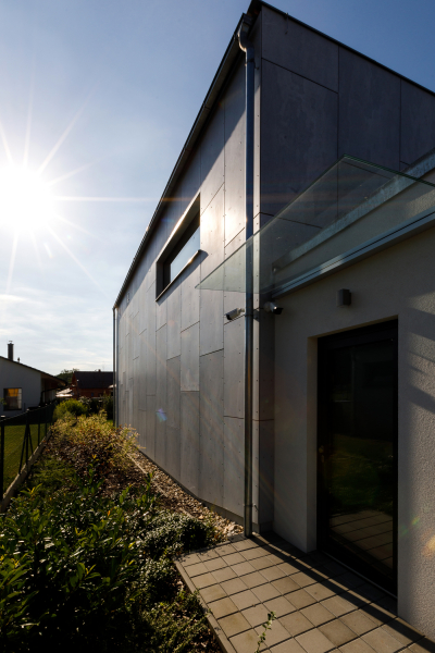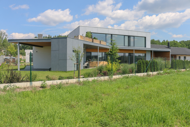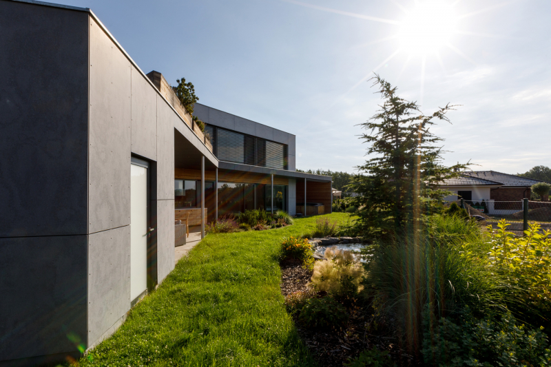 Z jižních oken a zahrady jsou pěkné výhledy na pohoří Blanského lesa. „Z pracovny v patře vidím až na Kleť,“ pochvaluje si investor. Na horním podlaží jsou ještě dva pokoje připravené pro děti s koupelnou a šatnou, odevšad je přístup na střešní terasu. Nedávno narozený první syn však zatím pobývá v ložnici rodičů v přízemí.