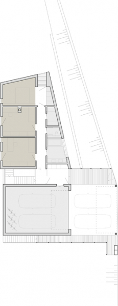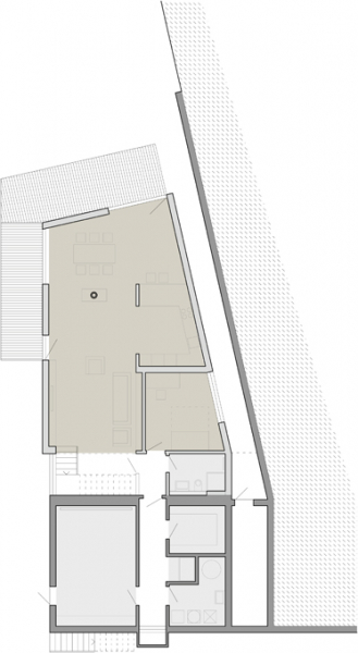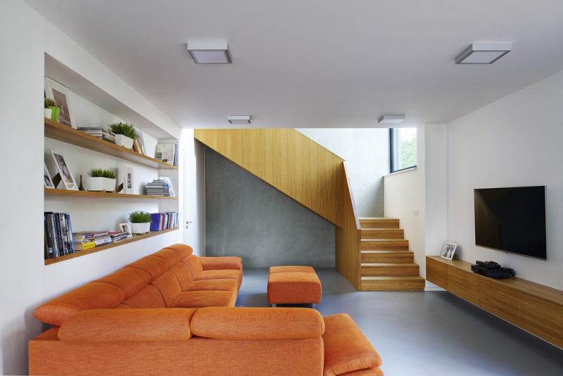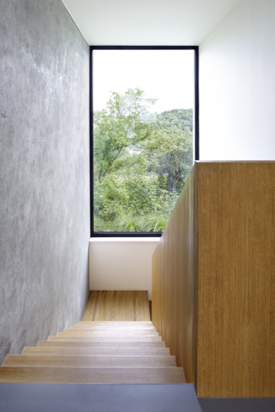 Parcela ve tvaru dlouhého trojúhelníku položeného ve svahu přitom byla pro definování stavby složitá. Interiéry překvapí už za vstupními dveřmi: krásná a přitom vlastně úplně jednoduchá chodba u ložnic, schodiště s obrazem velkého okna s krajinou. Tato kompozice se architektovi skutečně povedla. V celém domě dominuje matná litá podlaha, kterou dobře doplňuje pečlivě zvolený nábytek: dokonalá bílá kuchyň, dubový jídelní stůl se židlemi a horizontální skříňky z dubu. Většina nábytku je řešena na míru s ohledem na atypické rozměry a úhly.