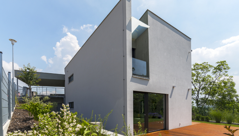 Z důvodu kontaktu nebytové části s terénem byla zvolena nosná konstrukce z betonových tvárnic. Nachází se v nejvyšší části pozemku, kde je také vjezd. Jsou tu sklady, dvojgaráž a technická místnost. Ke stavbě z betonu pak autor přisadil obytnou část s dřevěnou konstrukcí. V podstatě tedy jde o dvě stavby, mezi něž je vložen spojovací krček se schodištěm. Na masivní části domu je šedá fasáda, obytná část má omítku bílou.