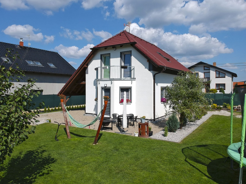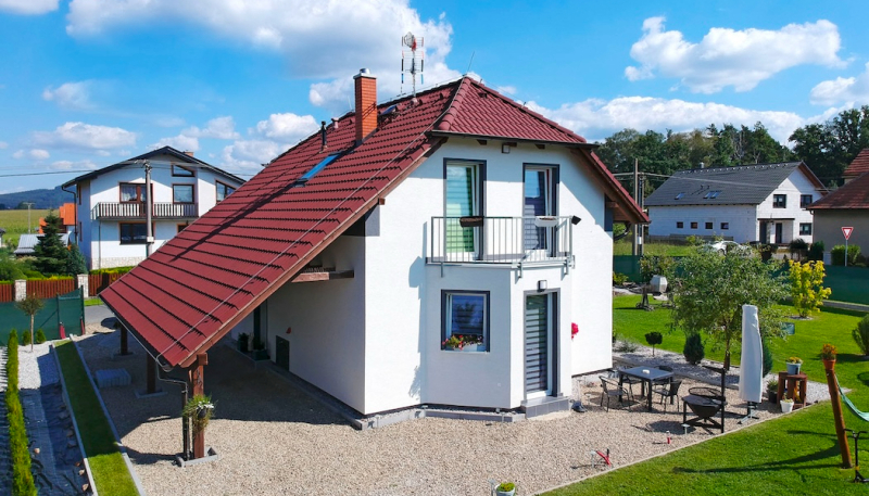 „Dominantou exteriéru je pásové okno v patře, které ,obtéká‘ dům ze tří světových stran,“ navazuje na architektku Roman Novotný, obchodně-technický specialista z realizační firmy DAFE-PLAST Vlašim: „Na severní straně domu je pásové okno přerušeno, aby zde mohla být umístěna další dominanta, a to prosklení schodiště s dvoukřídlými vedlejšími dveřmi, kterými je přístupný úložný prostor pod schody. Sestava oken kopíruje šířku dveří a stoupá z přízemí až do celé výšky prvního patra, je vysoká 5,1 m.“