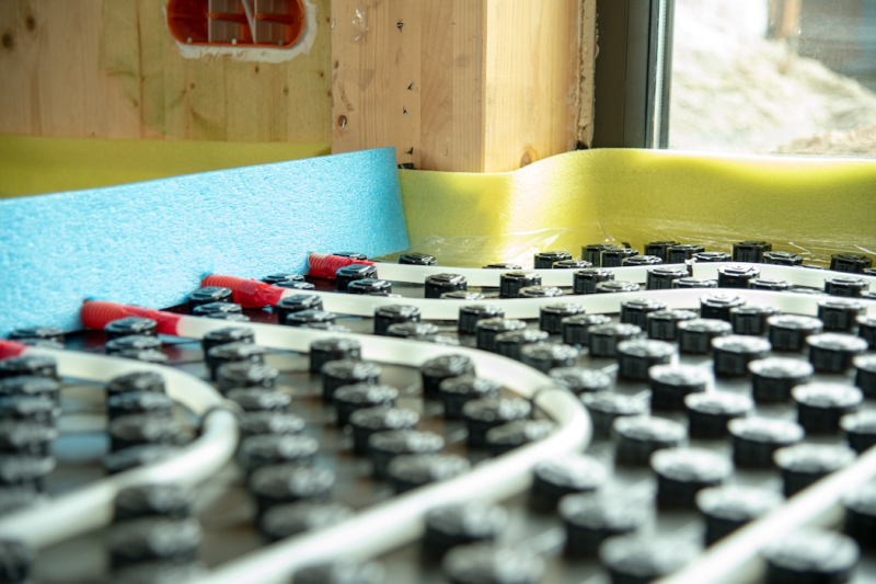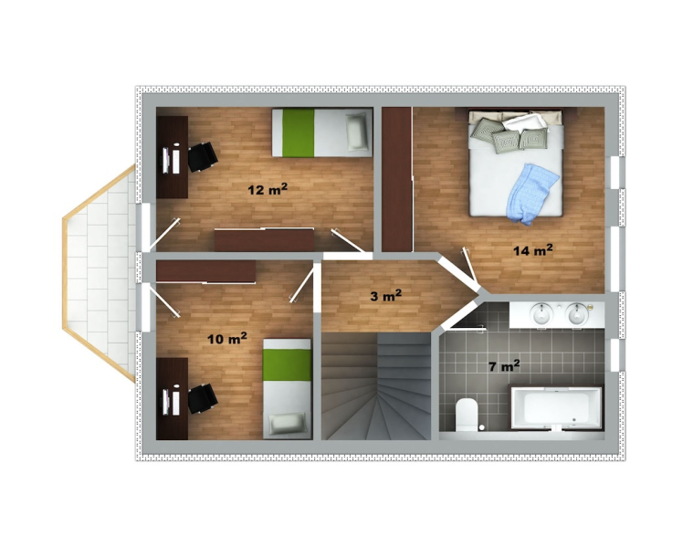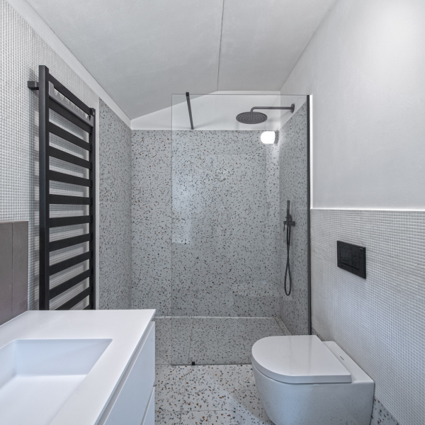 Pojícím prvkem mezi přízemím a patrem je nejen schodiště, ale patra jsou propojena i designově, a to keramickou dlažbou s dekorem terazzo, která tvoří podlahy kuchyně a zádveří v přízemí i nahoře v koupelnách, kde bylo terazzo vytaženo i na stěnu sprchového koutu či vytvořilo obklad vany. Samozřejmostí jsou i zde hladké světlé interiéry. Levá půlka patra byla koncipována pro rodiče (ložnice, šatna, koupelna) a pravá půlka je královstvím pro děti (dva pokoje se společnou koupelnou).