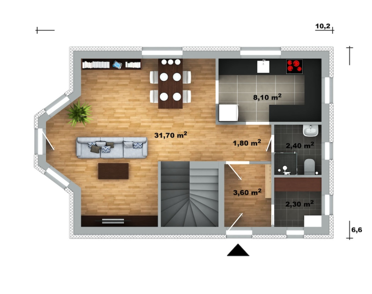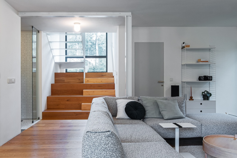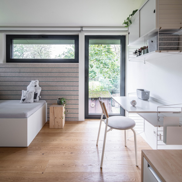 Dubová podlaha obývacího pokoje přechází do několika dřevěných stupňů schodiště, kde lze i posedět nebo umístit květinovou dekoraci. A na toto kaskádovité pódium navazuje subtilní, laserem vyřezávané, bílé ocelové schodiště, které uvolnilo cestu světlu zvenčí, prostřednictvím již zmíněného pětimetrového okna. „V přízemí jsme prostor více otevřeli, součástí obývacího pokoje se po odstranění příčky stalo i schodiště. Když dnes tedy vejdete do domu, nevidíte proti sobě stěnu jako dříve, ale vidíte protilehlým oknem ven, do přírody. Benefitem tohoto průhledu je i více světla v interiéru,“ popisuje proměnu ing. arch. Tereza Čudová Ajmová: „Schodiště bylo připraveno na dílně do jednotlivých dílů, které se na stavbě sestavily a sešroubovaly jako skládačka – protože se jedná o dřevostavbu, netroufli jsme si ocelové části svařovat. Původní masivní schodiště oknu stínilo, navíc prostor pod ním nebyl využitý. To jsme změnili. Pustili jsme do interiéru přirozené světlo, vytvořili úložný prostor přístupný zvenčí domu a na dřevěných stupních se dá spočinout. Není to jen hluchý prostor, kam si sedá prach.“