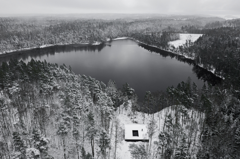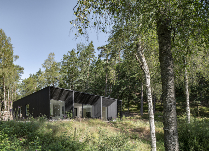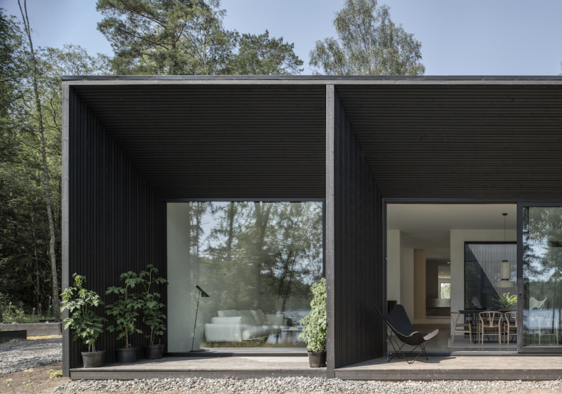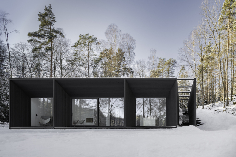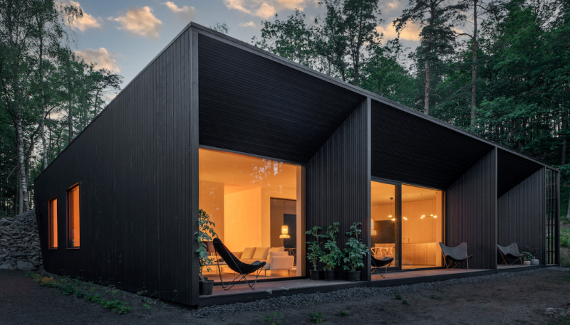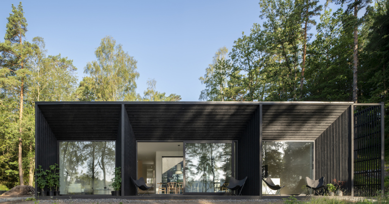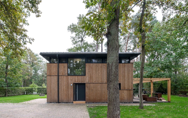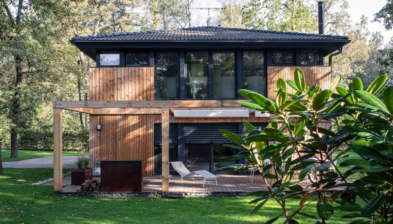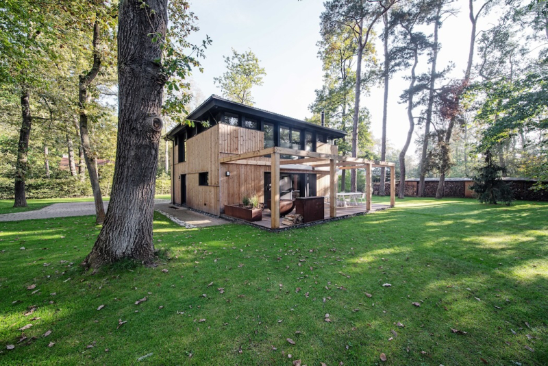 Nová fasáda ze svislých borovicových prken svou přirozenou barvou (namísto původního červenohnědého nátěru a la ořech) více ladí s lesním a relaxačním charakterem okolí, který si osada dodnes udržuje. V kombinaci s pásem oken, který dům opticky snížil, pak výrazně vylepšila proporce objektu a z kostky se stanovou střechou ve stínu stromů vystoupila na výsluní parádní dřevostavba.