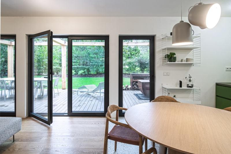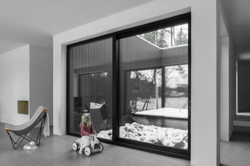 Hlavní vchodové dveře: Schüco AD UP 90 Design Edition (oboustranně překryvná hliníková výplň se zapuštěným madlem přímo integrovaným do dveřního profilu) s elektromechanickým samozamykacím zámkem Schüco SafeMatic, na otisk prstu Schüco Easy a s bočním světlíkem proskleným mléčným sklem