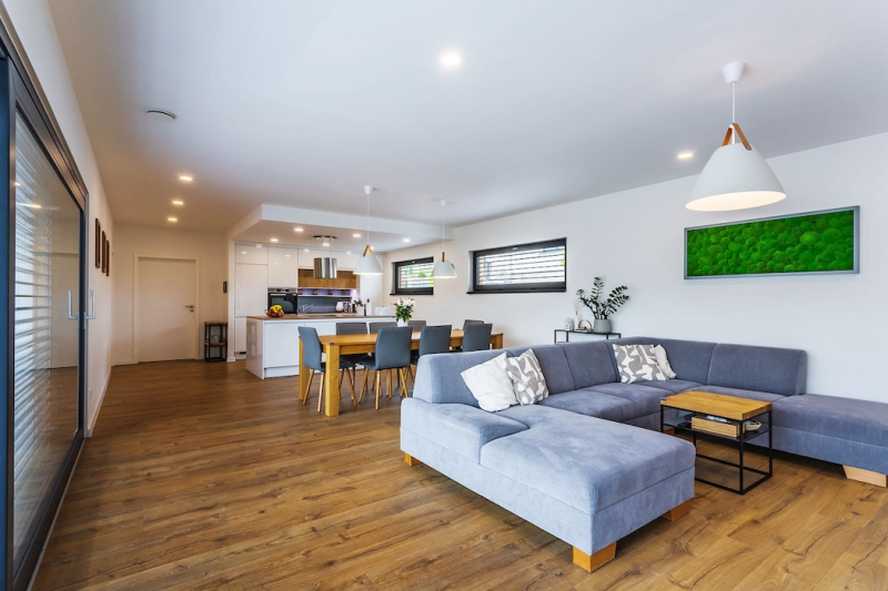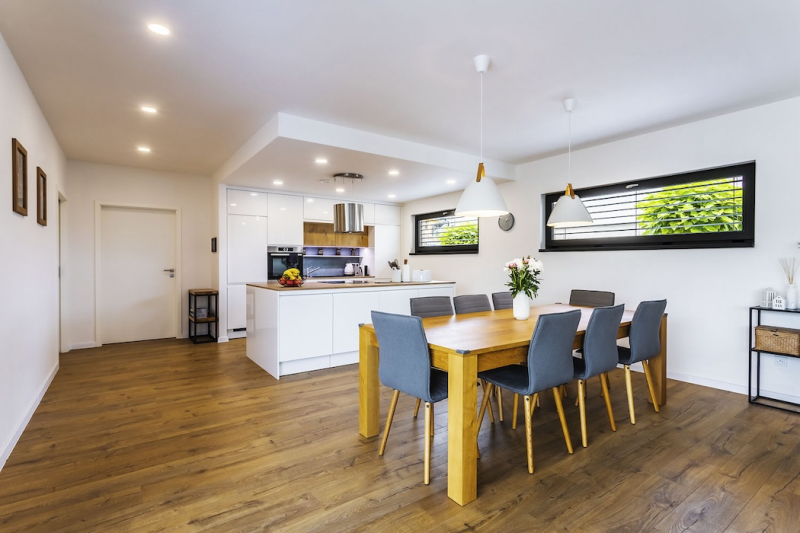 Filozofie architekty, že „interiér dělá světlo“, se propsala nejen do větších oken, ale i do designu interiéru. „Záměrem bylo vytvořit co nejprosvětlenější dům, ale zachovat všechny okolní vzrostlé stromy, které sice částečně brání přístupu přirozeného denního světla, ale dodávají pozemku neobyčejnou atmosféru. Původní interiér byl tmavý, stejně jako fasáda laděný do červenohnědého tmavého ořechu, proto jsme zvětšili okna, zjednodušili jejich členění, aby ubyly masivní sloupky a nově vybavili interiér světlými prvky a materiály. Pokládali jsme nové dubové podlahy, spíše čistší dekor s malým množstvím suků, nové bezobložkové dveře jsou světlounce šedé, stěny jsou bílé. Ladili jsme dům s okolní přírodou jak zvenčí, fasádou z thermo borovice, tak i v interiéru nábytkem. Na motiv přírody odkazuje i zelená kuchyňská linka,“ pokračuje architektka.