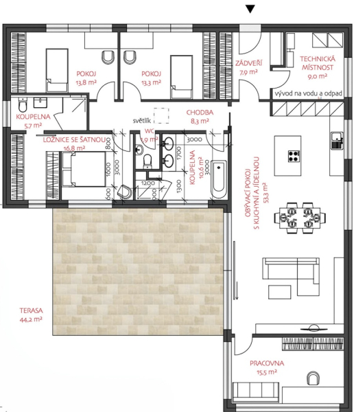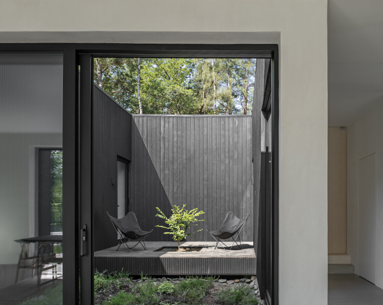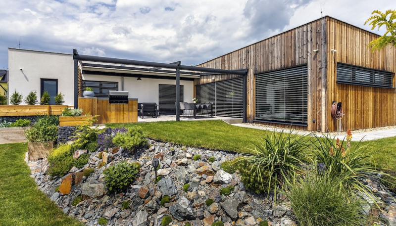 Výrazného zvětšení na celou šíři domu se dočkala terasa, stíněná shrnovacími textilními baldachýny vloženými do rastru z dřevěných trámů. Zatímco v létě baldachýny efektivně odstíní sluneční paprsky, v zimě se odsunou, aby obývacímu pokoji neubíraly rekonstrukcí získané denní světlo.