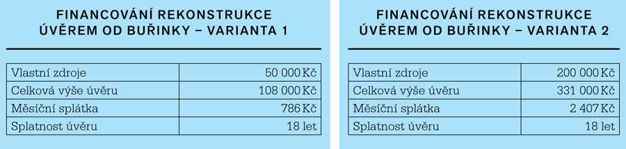 Obecný příklad: Úvěr od Buřinky ve výši 200 000 Kč se splatností 18 let a roční úrokovou sazbou 5,25 % se skládá z překlenovacího úvěru poskytnutého s úrokovou sazbou 5,25 % p. a. (pevná sazba) na 2 roky do přidělení úvěru ze stavebního spoření. Splácet budete měsíčně 1 455 Kč po dobu 24 měsíců. Za zpracování úvěru zaplatíte jednorázově 2 000 Kč, za vedení úvěru 0 Kč. Na překlenovací úvěr navazuje úvěr ze stavebního spoření poskytnutý na dobu 16 let, který je použit k úplnému doplacení překlenovacího úvěru. Úroková sazba je 5,25 % p. a. s fixací po dobu prvního roku a následně vždy na 3 roky. Splácet budete měsíčně 1 455 Kč po dobu 192 měsíců, cena za vedení úvěru je 0 Kč. RPSN Úvěru od Buřinky činí 5,57 %. Celková částka splatná spotřebitelem za Úvěr od Buřinky je 314 715 Kč. Uvedené údaje platí za předpokladu čerpání celého úvěru v den jeho poskytnutí se splácením od následujícího měsíce vždy k 25. dni.