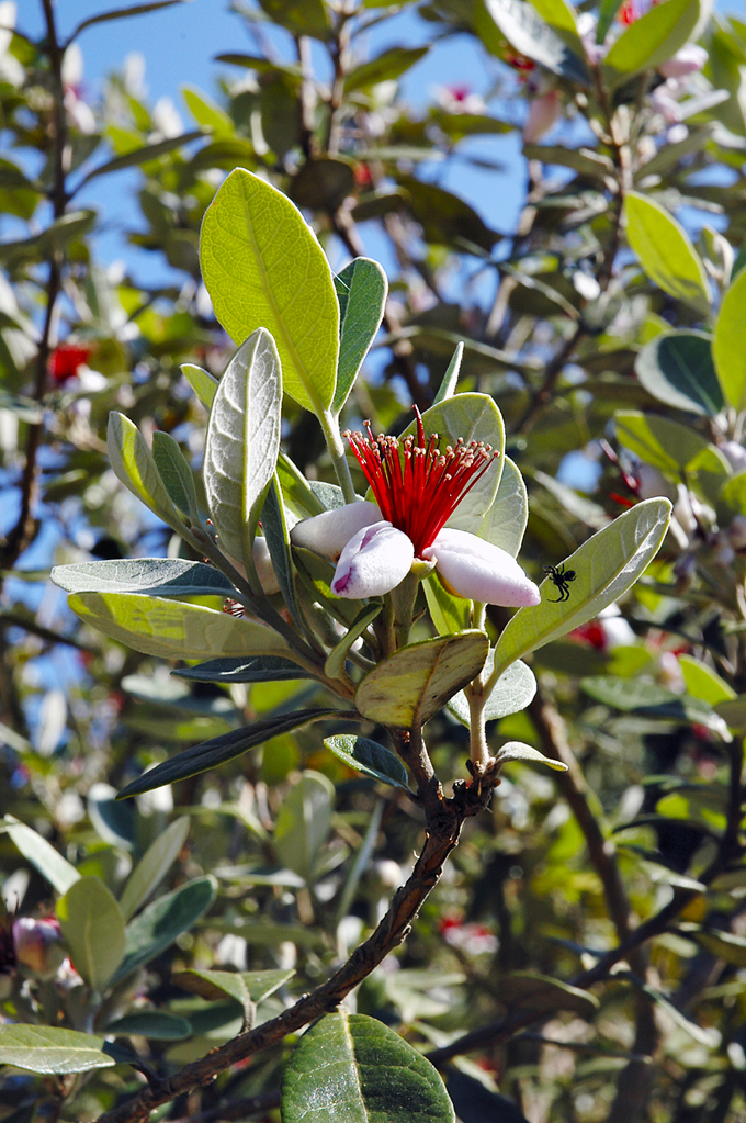 Atraktivně kvete i keřík Acca selloviana. Pochází z jihu Brazílie, Argentiny a Bolívie, ale dnes se s ním lze setkat v subtropech celého světa. Stálezelený keř s tuhými listy dorůstá v květináči asi dvoumetrové výšky (v přírodě dosahuje i trojnásobku).