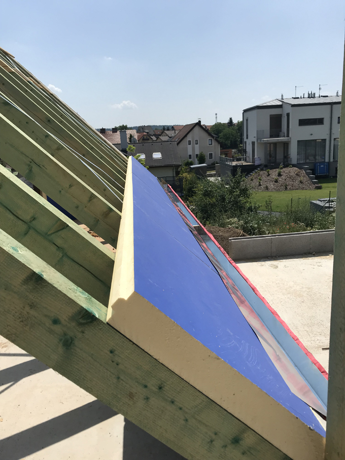Důležitou součástí konstrukce střešního pláště je izolace. Volba izolantu a technologie aplikace jsou určující pro životnost střechy i následný uživatelský komfort. Na krokve se pokládá nadkrokevní izolace Tondach iRoof tloušťky 120 mm. Desky jsou z tvrdé polyisokyanurátové pěny (PIR) a tvoří difuzně otevřený systém. PIR izolace patří v současné době mezi nejmodernější a nejúčinnější izolační materiály. Její výhodou oproti klasickým izolantům je, že dosahuje stejného tepelněizolačního výkonu při nižší tloušťce desky. Šetří tak místo, stavební náklady, náklady na množství materiálů v navazujících stavebních technologiích a čas. Při aplikaci PIR izolací nevznikají tepelné mosty. Další výhodou je tvrdost desek umožňující snazší pohyb po střešním plášti. Desky se spojují pomocí zámků a následně kotví vruty do krokví.