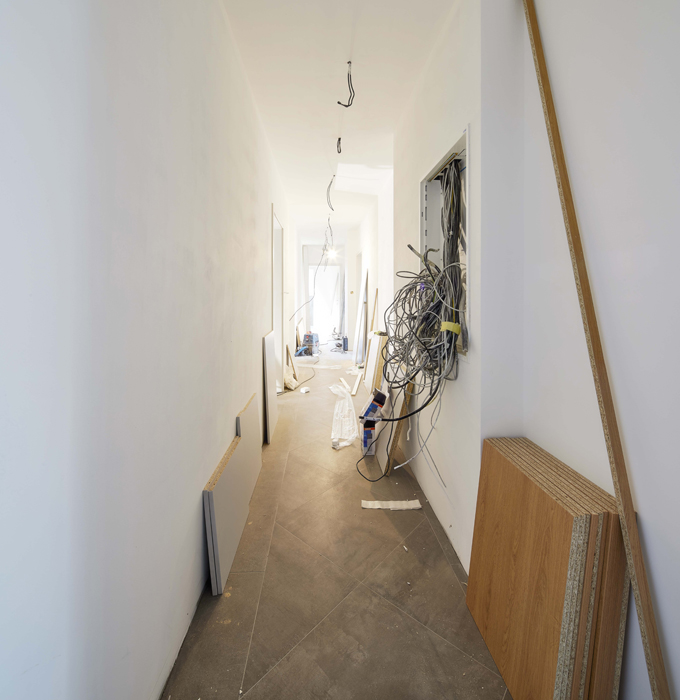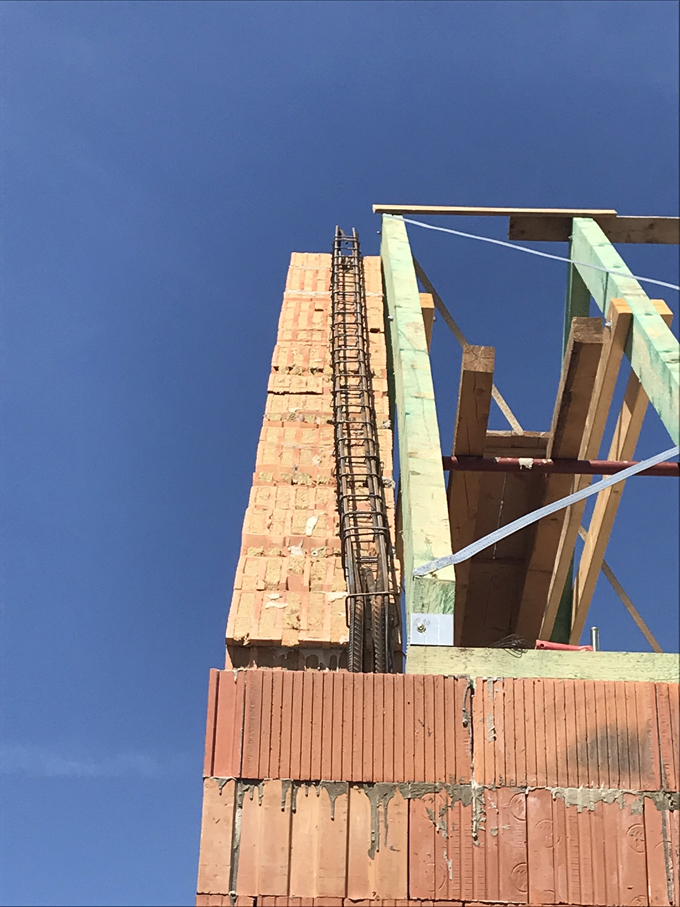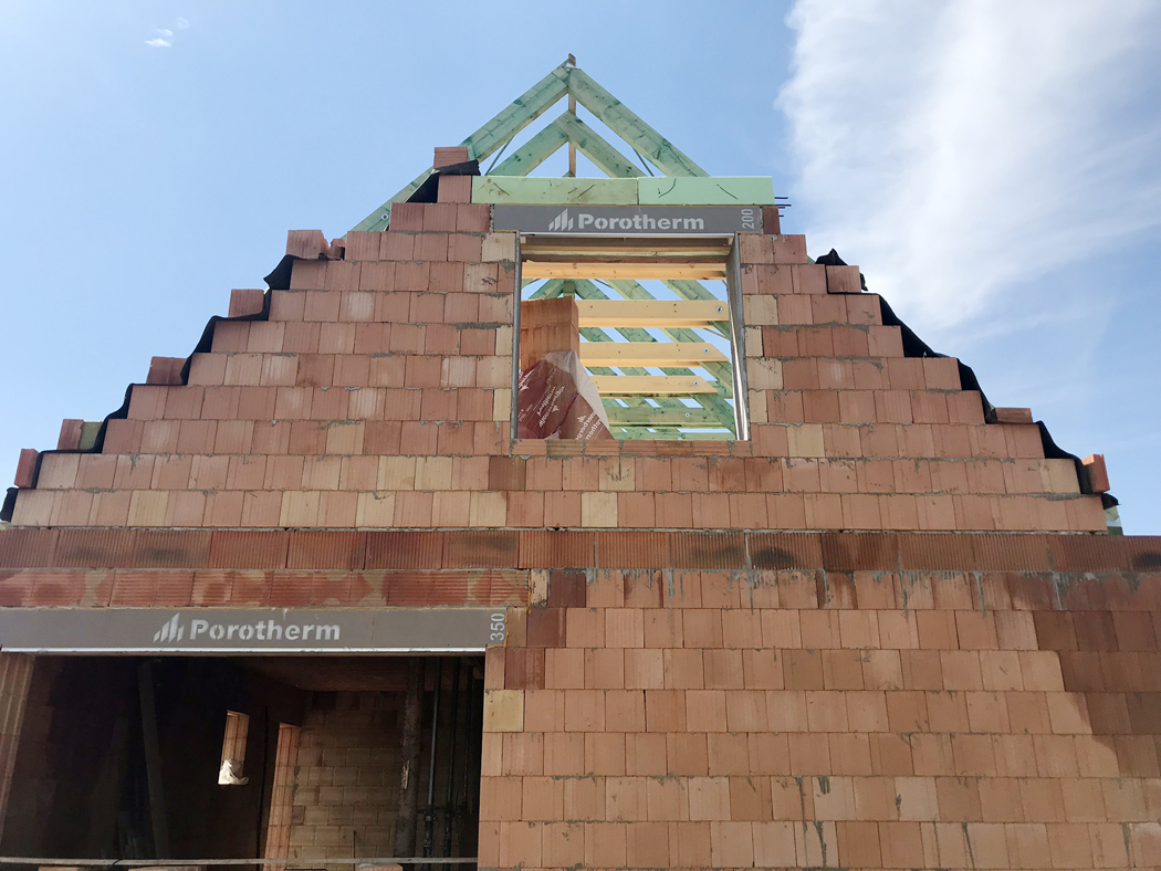Vyzdívky štítů se provádí opětovným založením první vrstvy cihel na zmonolitněnou stropní konstrukci. Předklady nad okny ve štítě je možné řešit atypicky zvýšenou vrstvou polystyrénu, a to z toho důvodu, že uložení překladu PTH7 (Porotherm překlad 7) nad roletovou schránkou není technicky možné. Překlad PTH7 se rozměrově do štítu nad oknem nevejde, což je dobře porovnatelné i prostým okem, když na fotografii porovnáte tento atypický detail s konstrukčním řešením dolního okna. Atypický detail je možné v tomto případě použít především proto, že zatížení překladu ve štítě není tak vysoké jako ve spodním patře. Jedná se o minimální ukončení štítu, které by v případě tohoto atypického detailu nemělo mít negativní dopad na statiku. Ve štítové stěně se tvarovky seřezávají podle sklonu střechy a připravují se na následný štítový věnec.