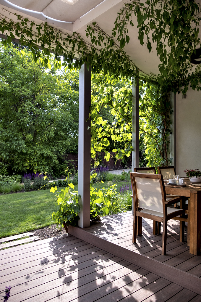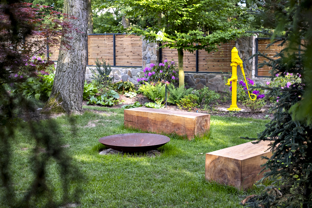 „Určujícím prvkem pro nás bylo natočení domu a jeho obytných částí směrem do zahrady. Plocha terasy byla úzká, takže jsme ji doplnili o dva schody a přidali ještě jednu terasu, na kterou navazuje koupací jezírko. Terasa i jezero jsou zabalené do zeleně, aby se staly přirozenou součástí zahrady. Prvky jako příjezdová cesta a zeleninová zahrada vycházely z již majiteli vyzkoušených funkčních principů, řešili jsme tedy vzhled, dimenze a celkově jsme uhladili tvary záhonů, aby zahrada nepůsobila příliš chaoticky a zjednodušila se údržba trávníku,“ upřesňuje Markéta Mlejnková. Venkovský charakter dávají zahradě nejenom mlatové cesty, ale také ohniště, dřevník a funkční studna.