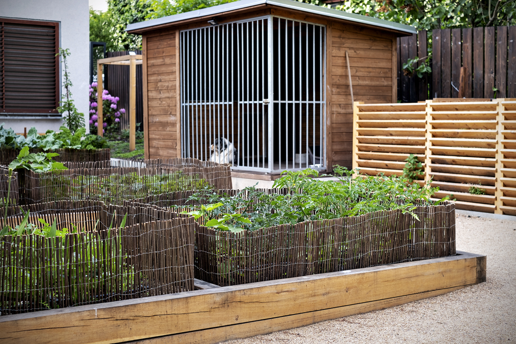 Součástí zahrady jsou i vyvýšené záhony, které jsou pro pěstování rostlin velmi praktické a díky barevnému nátěru oživují celou zahradu. Exteriér tak nabízí rozličné podoby vizuálních zážitků. Mile působí i zeleninová zahrádka s výsadbou léčivek a koření. Hospodářský ráz dává celému prostoru nejenom již zmíněný dřevník, kůlna a klasická pumpa, ale také kompost umístěný ve stylové dřevěné konstrukci.