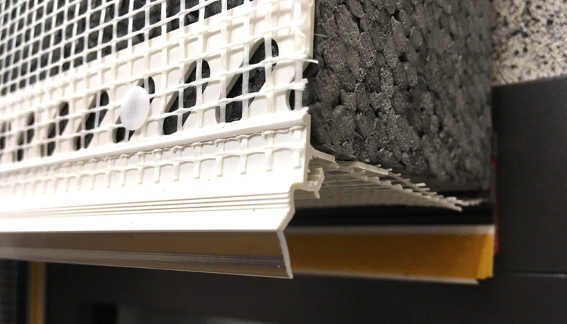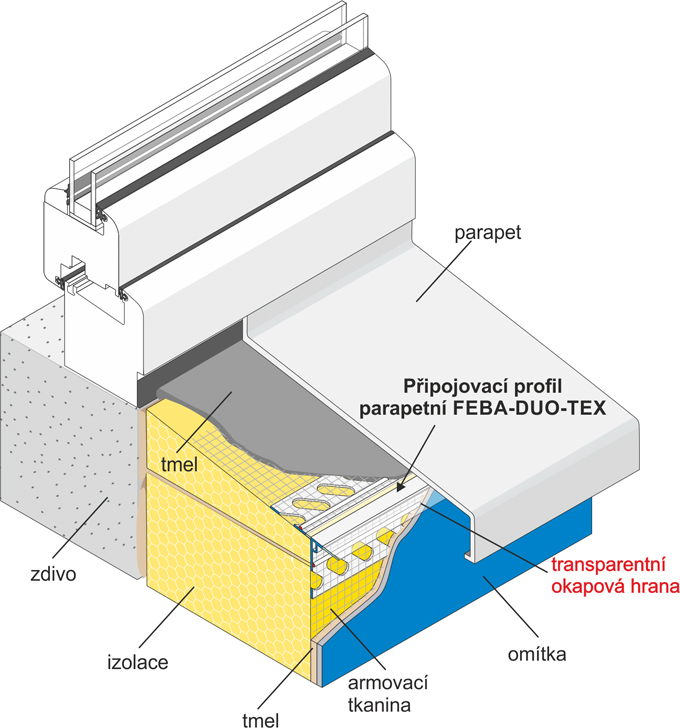 Připojovací profily umisťované pod parapet zajišťují napojení omítky k parapetu. Zabraňují tedy zatékání hnaným deštěm tlačeným nahoru do spár, obdobně jako ukončovací profily, navíc parapet drží na správném místě. Barevně harmonické napojení ETICS ke spodní straně parapetu nabízí další novinka HPI-CZ, připojovací profil parapetní FEBA-DUO-TEX s transparentní okapovou hranou. Profil zajišťuje jednoduché napojení parapetu v různých úhlech. Je opatřen dvěma částmi tkaniny: První se vkládá do cementového stěrkového tmelu v oblasti parapetu – na toto lože je lepen parapetní plech. Druhá část pak vede do plochy izolantu. Transparentní hrana se nachází na spodní straně parapetu. Jediné, co tedy kolemjdoucí mohou vidět, resp. nevidět, z tohoto profilu na fasádě, je právě transparentní hrana.