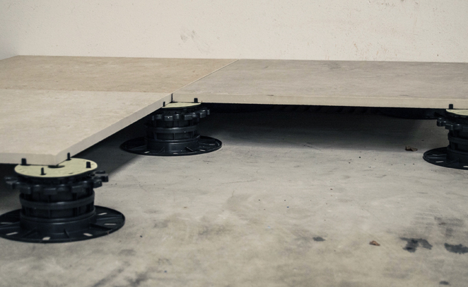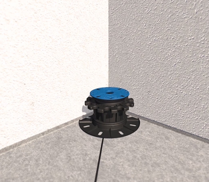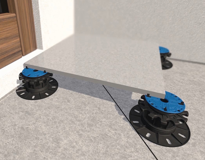 Pevný terč pod dlažbu: Tento typ nízkých podstavců (14 mm + křidélka) umožňuje pokládku podlahy z terasových samonosných dlaždic nasucho, například na zaizolovaných střechách, terasách, nebo balkónech. Montáž dlažby je rychlá, nenáročná a, stejně jako u jiných terčů, lze konstrukci snadno kdykoliv rozebrat. Součástí volitelného příslušenství terčů pod dlažbu jsou vyrovnávací a protihlukové podložky. Vyrovnávací podložky (1 nebo 3 mm) jsou určeny pro regulaci výšky jednoho nebo více terčů.