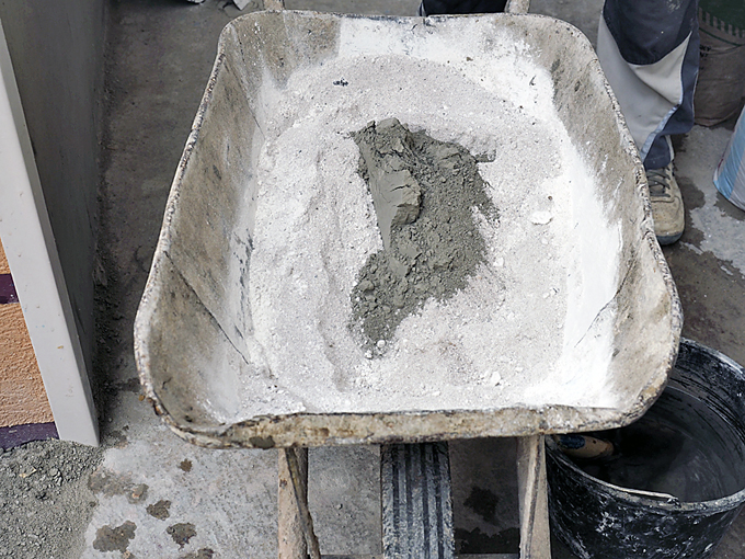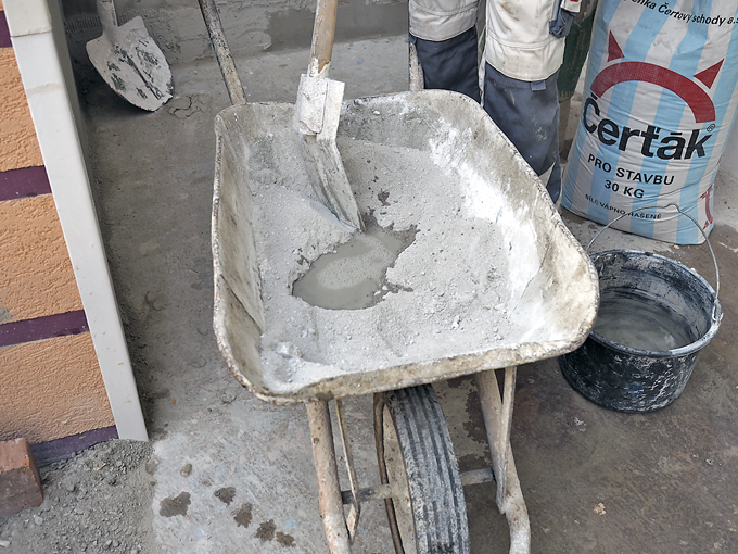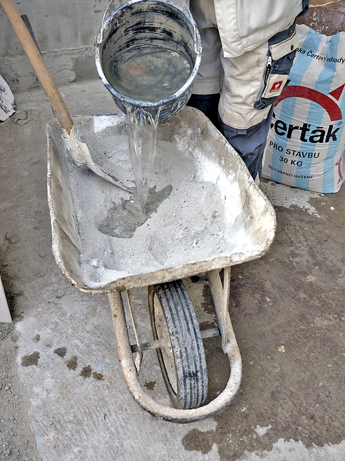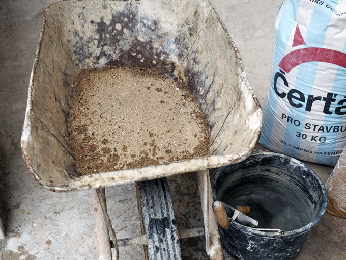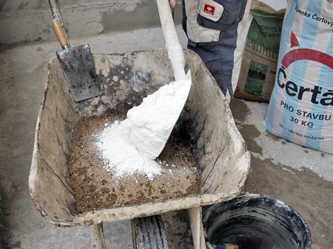 Pro směs na zdění smíchejte písek, vápno a cement v poměru 4 : 3 : 1. Písek je plnivo, vápno je pojivo. Směs si nejdřív smíchejte v kolečku nasucho a teprve po důkladném promíchání přidejte vodu. Čím déle mícháte, tím lépe.