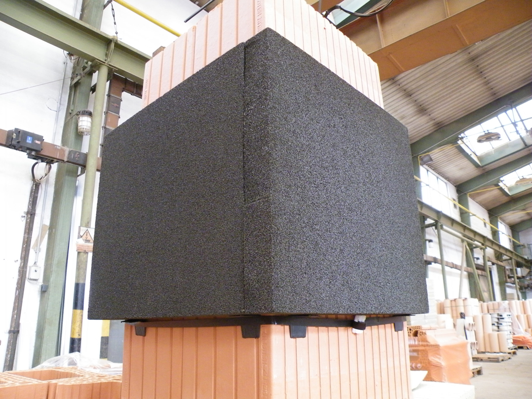 Parotěsný prostup pro cihelné komíny je určen k bezpečnému napojení parozábrany na komínové těleso. Jde o desky z pěnového skla – Foamglas, které se v požadovaném místě prostupu nalepí pomocí montážních pomůcek na komínové těleso. Po slepení desek vytváří parotěsný, nehořlavý a tvarově stálý prostup o velikosti 500 x 500 mm (resp. 500 x 900 mm).