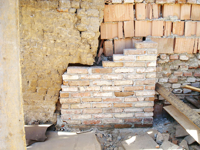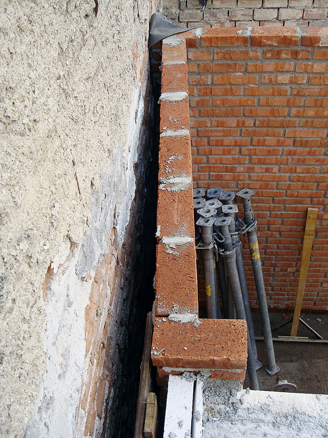 Během vyzdívání stěn v patře i přízemí jsme se dostávali do paradoxních situací. Snažili jsme se, aby stěny přilehlé k sousedům co nejtěsněji kopírovaly tvar těchto stěn. Šlo o to vytěžit co největší podlažní plochu a nevytvářet mezi domy zbytečné vzduchové dutiny. Stavební firma naopak z opatrnosti chtěla realizovat rovné stěny a pravé úhly v rozích. Mnohokrát jsme tak museli potvrzovat a ujišťovat, že některé stěny skutečně mají být křivé a rohy nemají mít 90 stupňů. U stěny skladu se nám to uhlídat nepodařilo a zhruba půl metru čtverečního tak bylo navěky zazděno.