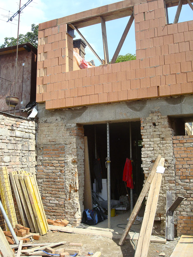 Stavba patra začala zděním štítových stěn a stěny do dvora, pro které jsme vybrali cihelné tvarovky s dutinami vyplněnými minerální vatou. Tento materiál jsme volili kvůli praktičnosti i požární bezpečnosti. Na společné hranici se sousedním domem se dobře zdí a není nutné mezeru vyplňovat tepelným izolantem. Po případném zbourání sousední nemovitosti zůstane na odhaleném štítu pevný povrch a nehrozí tak jeho poškození. Téměř celá stěna do ulice je prosklená.