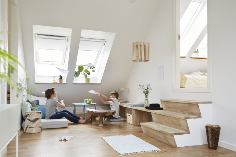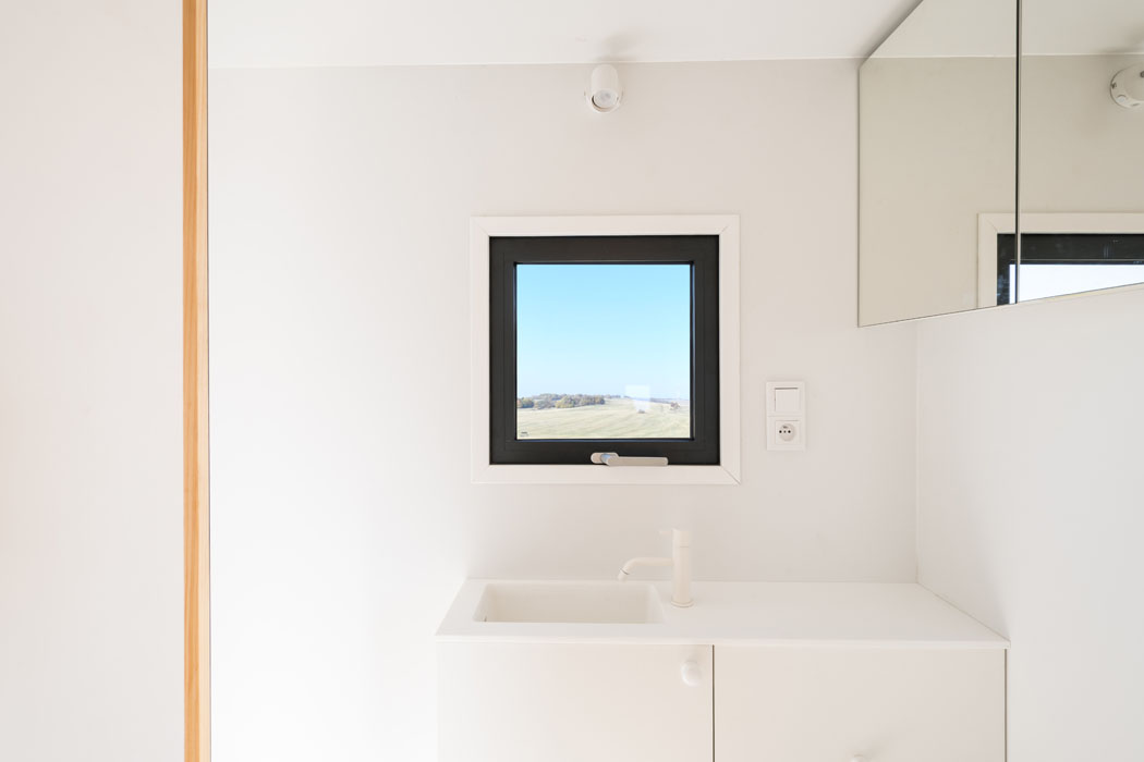 Místnosti jsme omezili na ložnici se šatním koutem, schodišťový prostor propojený s chodbou, velký dětský pokoj, který vede napříč celým domem, a koupelnu s WC a saunou. Celkem tedy pouhé čtyři prostory, na které připadá šest oken a jeden světlík. Prosvětlení se ukázalo jako dostatečné. Společný dětský pokoj obsadí dvě malé děti a využijí velkou volnou plochu na běhání a hraní. V budoucnu plánujeme do místnosti vestavět šatnu a rozdělit tak pokoj na dva malé. Z toho důvodu jsou do pokoje navrženy dvoje vstupní dveře a dvě velká okna na protilehlých stranách.