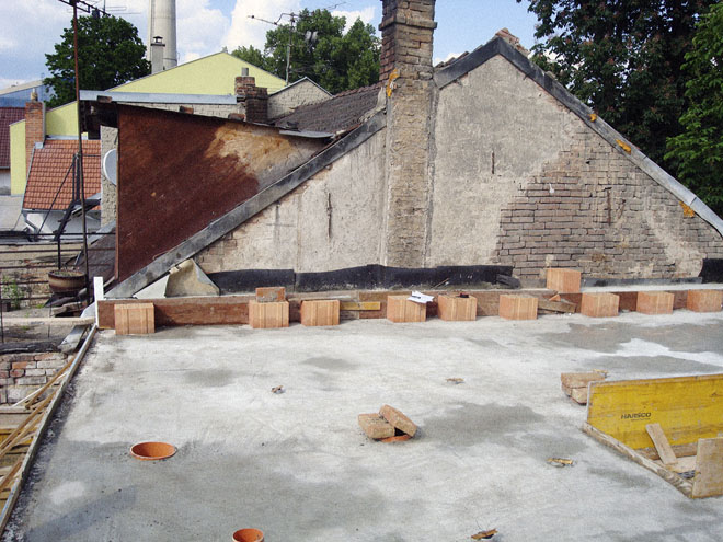 Podkladem byla rovná deska monolitického železobetonového stropu. Chtěli jsme vytvořit vzdušný otevřený prostor maximálně propojený s exteriérem prosklenými plochami. Protože v řadové zástavbě je možné prosvětlení jen z uliční a dvorní strany, navrhli jsme minimum místností a příčných předělů, které by bránily v prosvětlení.