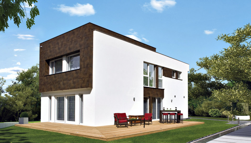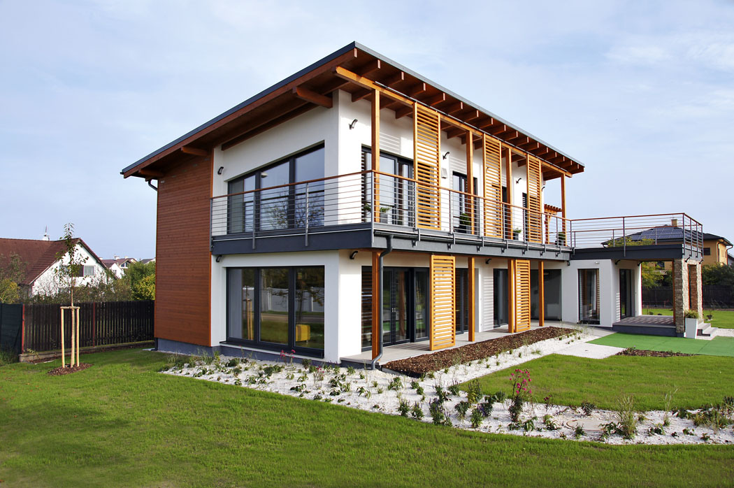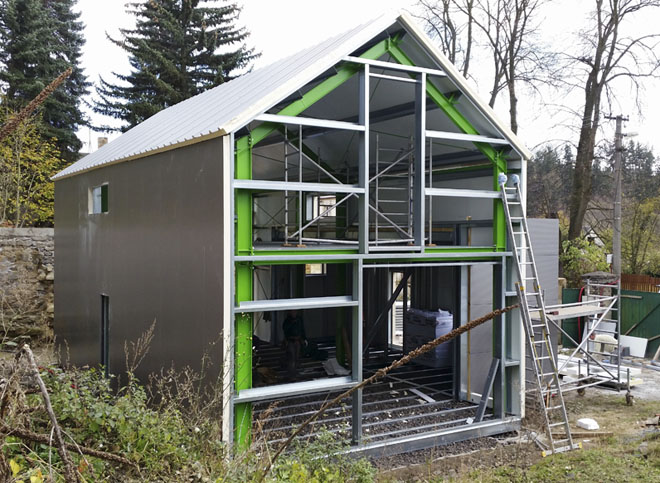 Dvoupodlažní montovaný RD v pasivním standardu (s energetickým štítkem A) sestávající ze stavebních komponentů Lindab od konstrukce domu přes fasádu až po střechu a okapové systémy. Na primární rámovou ocelovou konstrukci je zavěšen kompaktní sendvičový plášť pomocí sekundární konstrukce z tenkostěnných profilů.
