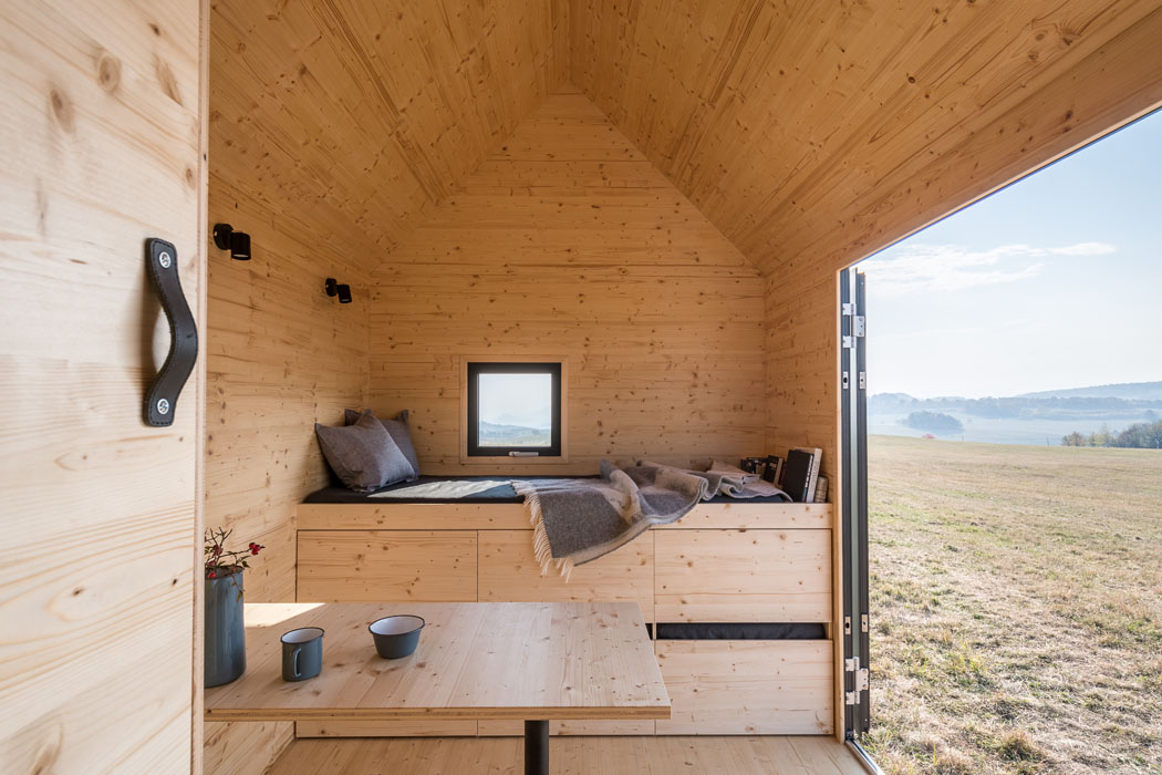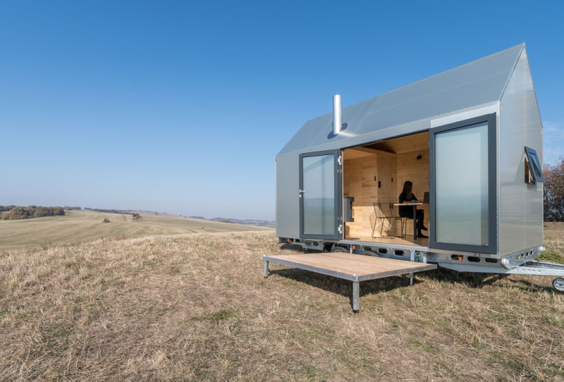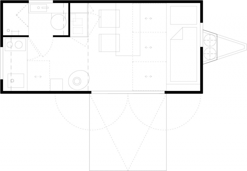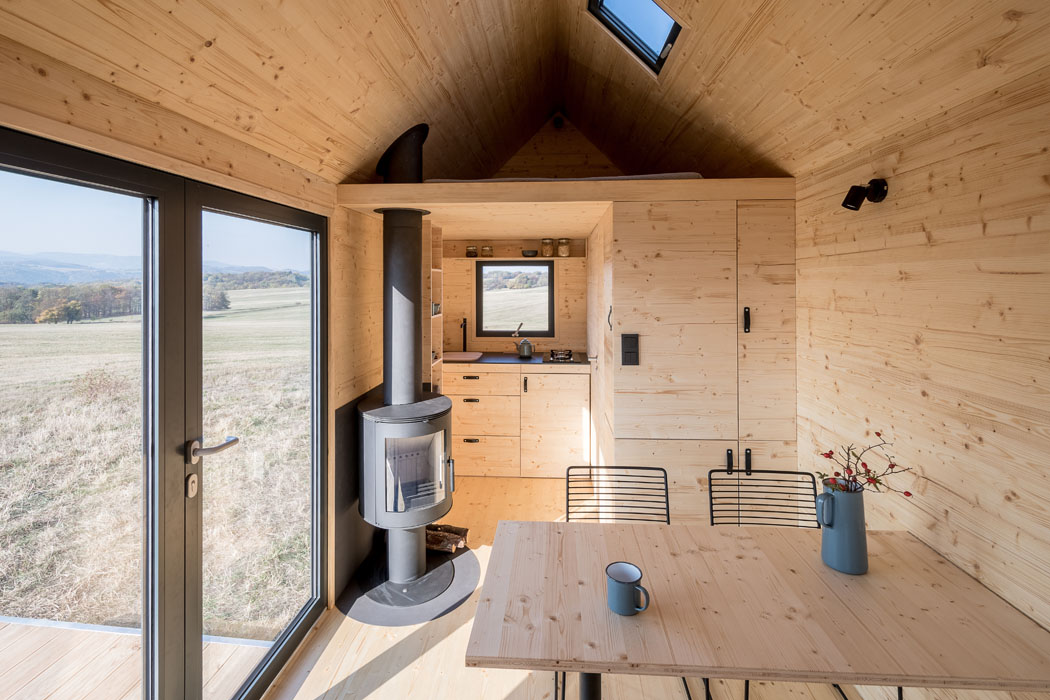 Dům je promyšlen do posledního nýtku. Každý milimetr prostoru je vyřešen tak účelně, že do něj sbalíte byt o velikosti 2+kk. Pomocí polohování vestavěného nábytku se může přizpůsobit dispozice různým funkcím, na vyvýšeném lůžku v přízemí s dvěma řadami výsuvných šuplíků se po rozložení vyspí dva lidé a nahoře v patře je ještě manželská postel. Plně vybavená kuchyň má dvě plynové plotýnky, nerezový dřez či vestavěné elektrické zásuvky pro další spotřebiče. Okna se vyklápějí ven, aby neubírala prostor uvnitř, plnohodnotná koupelna má sprchový kout, umyvadlo a chemickou toaletu. A srdcem domečku jsou krbová kamna na dřevo. Sklopná terasa přidá k užitné ploše interiéru (15 m2) další 4 m2.