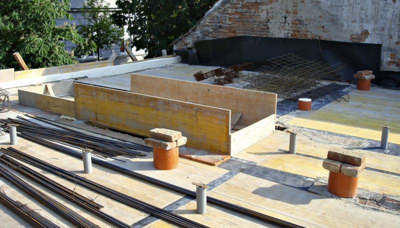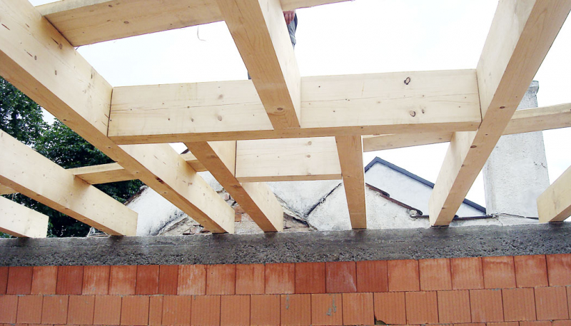 Ve vlastním domě jsme chtěli co nejvíce uplatnit přírodní materiály a zároveň materiálově navázat na původní nepálené cihly v přízemí. Zvolili jsme tedy pro vnitřní nosné i nenosné stěny tradiční hrázděné zdivo vyplněné dusanou hlínou. Následovalo usazení střešních trámů s dřevěným palubkovým záklopem, který jsme nechali v interiéru pohledový, parotěsná vrstva, tepelná izolace z pěnového polystyrenu seříznutého do 2% spádu a vrchní hydroizolační asfaltové pásy. Plocha střechy byla ukončena drenážní skladbou a 10 cm vysokou vrstvou lehčeného substrátu.